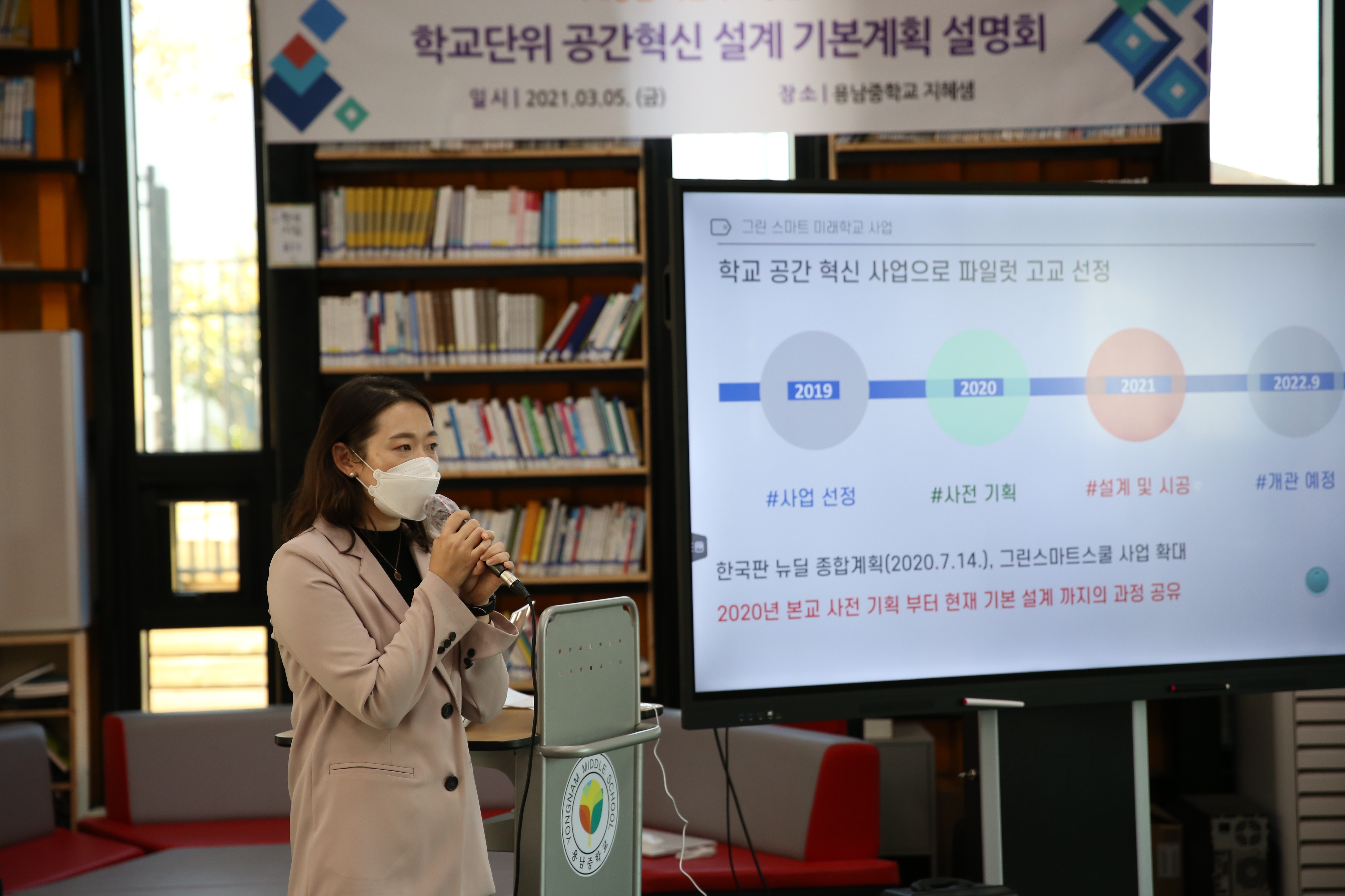 학교단위 공간혁신 설계 기본계획 설명회를 개최하였습니다. 본교 교사 개축을 위한 고민과 준비 과정을 설명하고, 진행 상황을 확인하였습니다. 설계를 맡으신 박기우 교수님의 설계 의도에 대한 설명이 있었으며, 참석해주신 내빈 여러분과 함께 미래학교가 나아가야 할 방향을 함께 고민해 본 의미있는 시간이었습니다. 새로워질 용남고등학교의 미래가 기대됩니다.