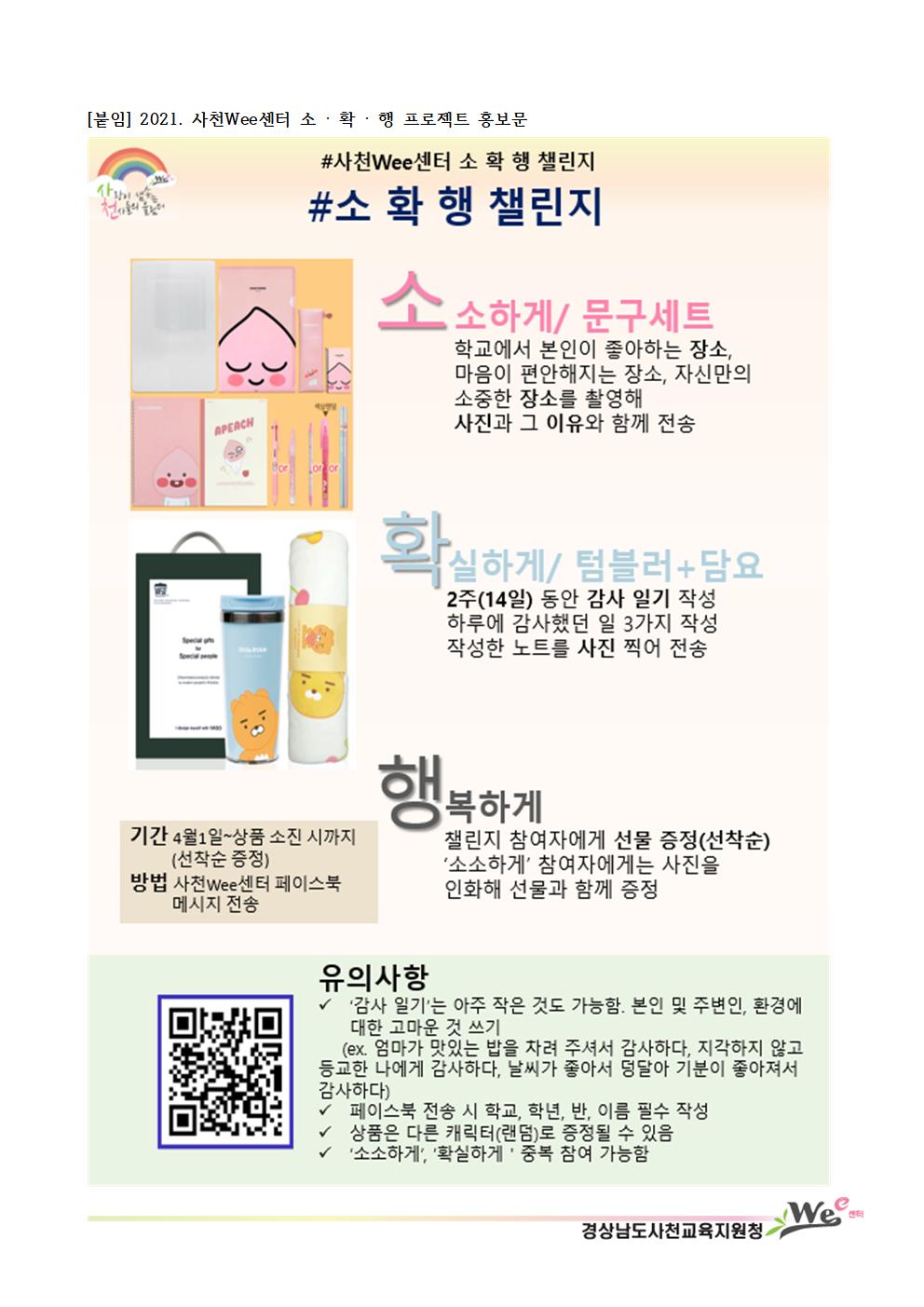 1. 기간: 2021. 4. 1.(목) ~ ‘소·확·행 선물’ 소진 시까지 2. 대상: 미션에 참여하는 중·고등학생(총 180명) 3. 내용 가. 장소편: 소소하게 1) 자신에게 가장 소중한 학교 공간 촬영 후 이유와 함께 사천Wee센터 페이스북으로 전송 2) 참여 방법: 페이스북 ‘사천 Wee센터’ 메시지 보내기 > 학교, 학년, 반, 이름, 미션 내용 3) 증정 방법: 한 달에 2회 Wee 클래스 및 상담담당자에게 전달 예정(선착순 증정) 나. 일기편: 확실하게 1) 2주(14일) 동안 감사일기 작성 2) 감사일기를 작성한 노트 · 메모장 등을 사진 찍어서 사천Wee센터 페이스북으로 전송 3) ‘감사일기’ ① 하루에 3가지씩 작성하기 ② 사소한 것이라도 작성 가능 ex ‘맛있는 밥을 해주신 엄마에게 감사하다.’ ex ‘학교에 지각하지 않고 결석하지 않는 나에게 감사하다.’ 4) 참여 방법: 페이스북 ‘사천 Wee센터’ 메시지 보내기 > 학교, 학년, 반, 이름, 미션 내용 5) 증정 방법: 한 달에 2회 Wee 클래스 및 상담담당자에게 전달 예정(선착순 증정)