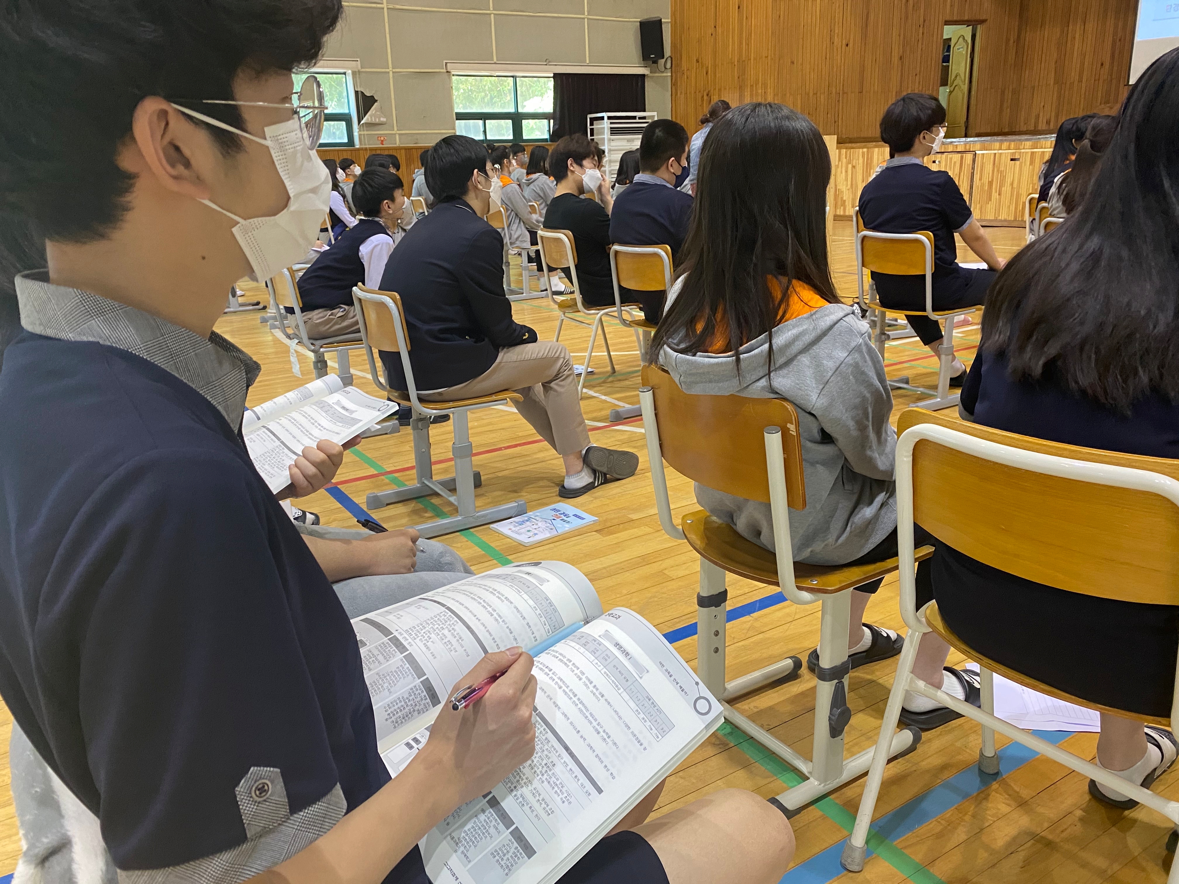 일시: 2021.05.27.(목) 5교시~8교시 장소: 도서관(1-1, 1-2) 및 체육관(1-3, 1-4) 대상: 1학년 재학생(111명) 내용: 과목 탐구 사전 활동지 작성(5교시), 선택 과목 안내(6~7교시), 과목별 상담 데스크 운영(8교시)
