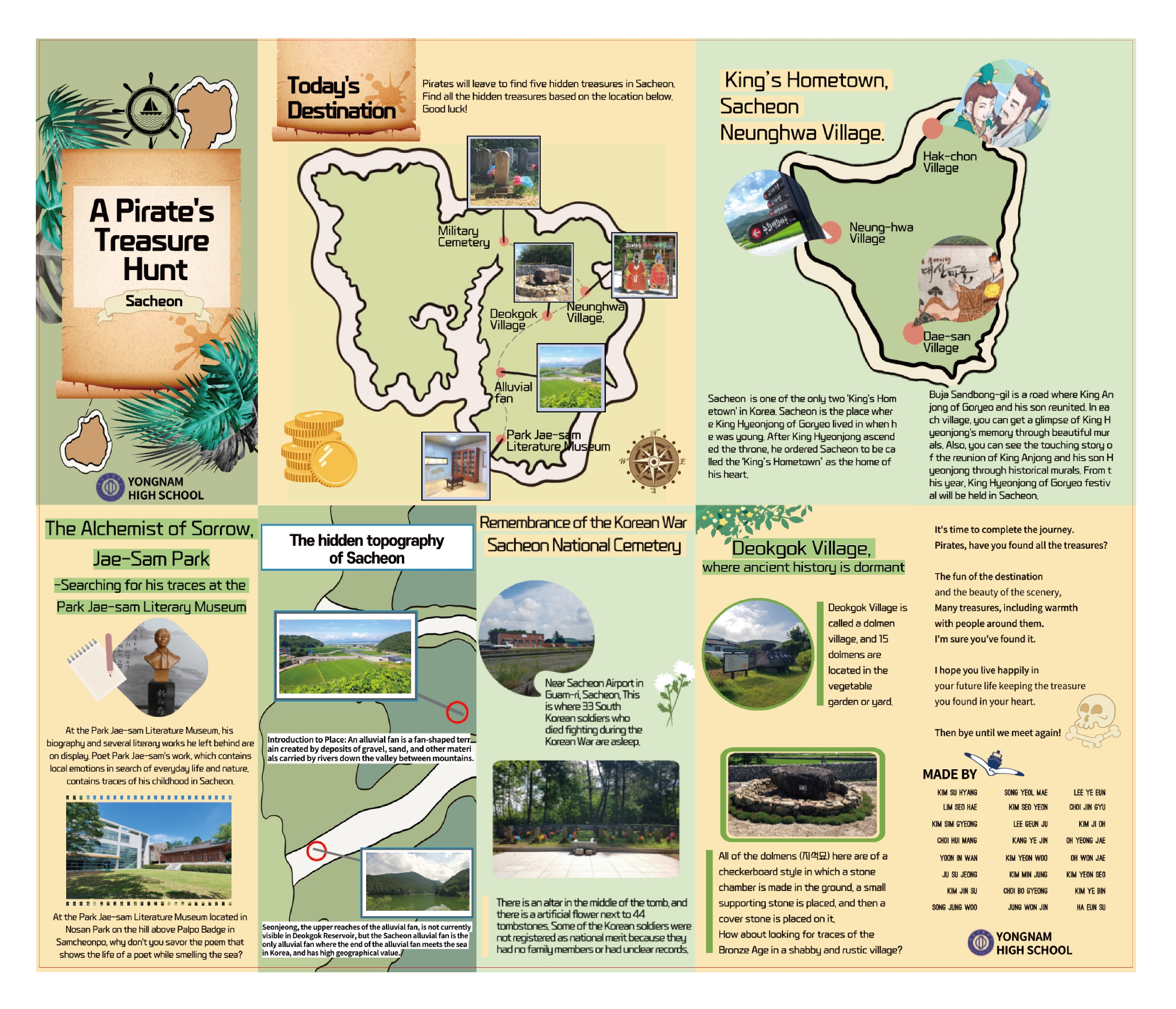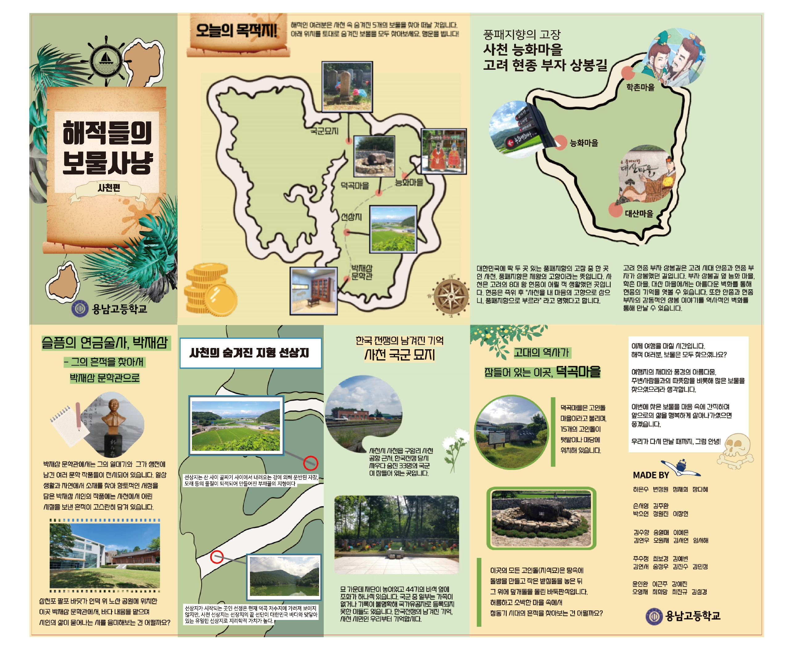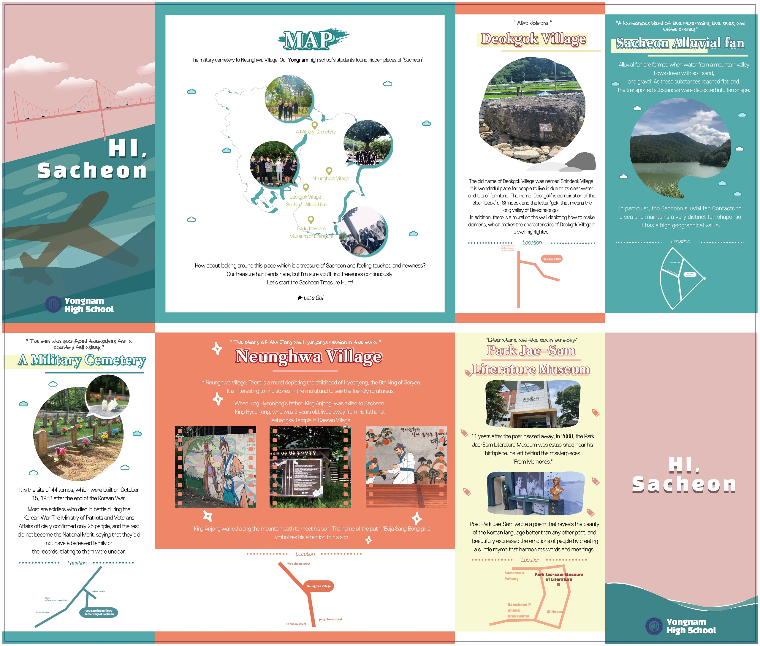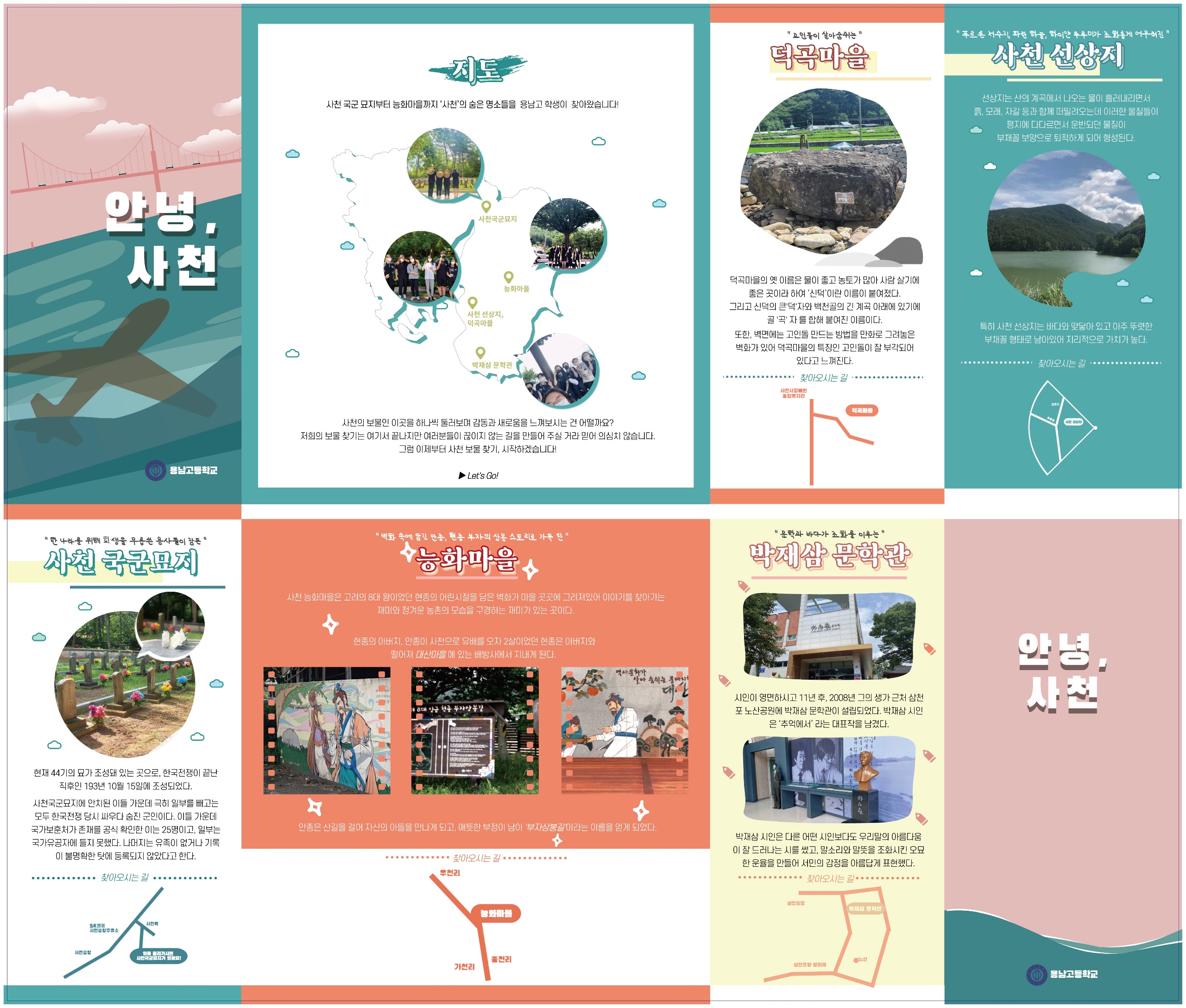 1학기에 진행했던 교과융합 프로젝트 <사천에 숨어있는 보물찾기(지리, 문학, 영어)>를 진행했던 학생들이 사천의 숨어있는 명소를 소개하는 리플릿을 제작하였습니다.