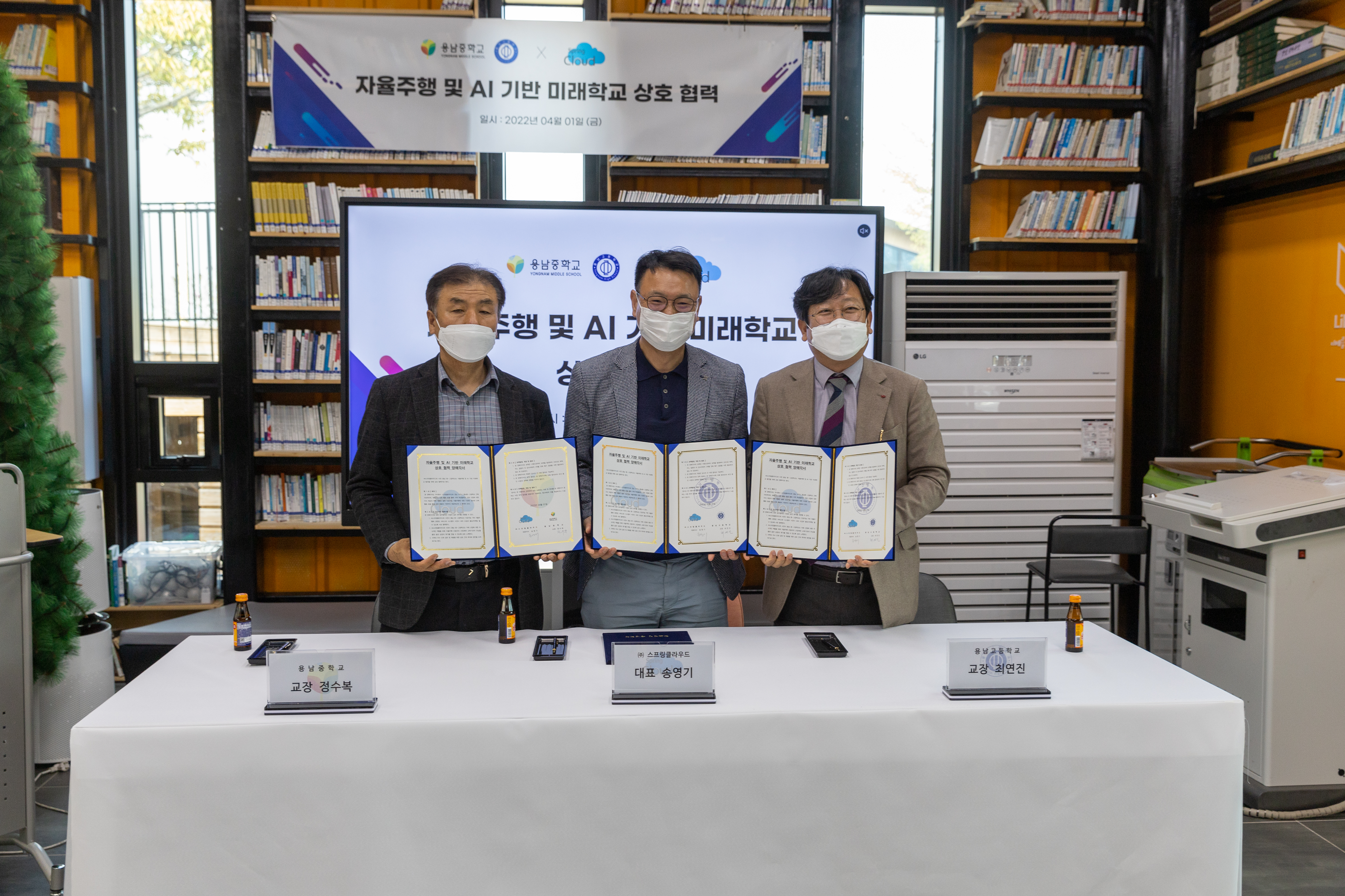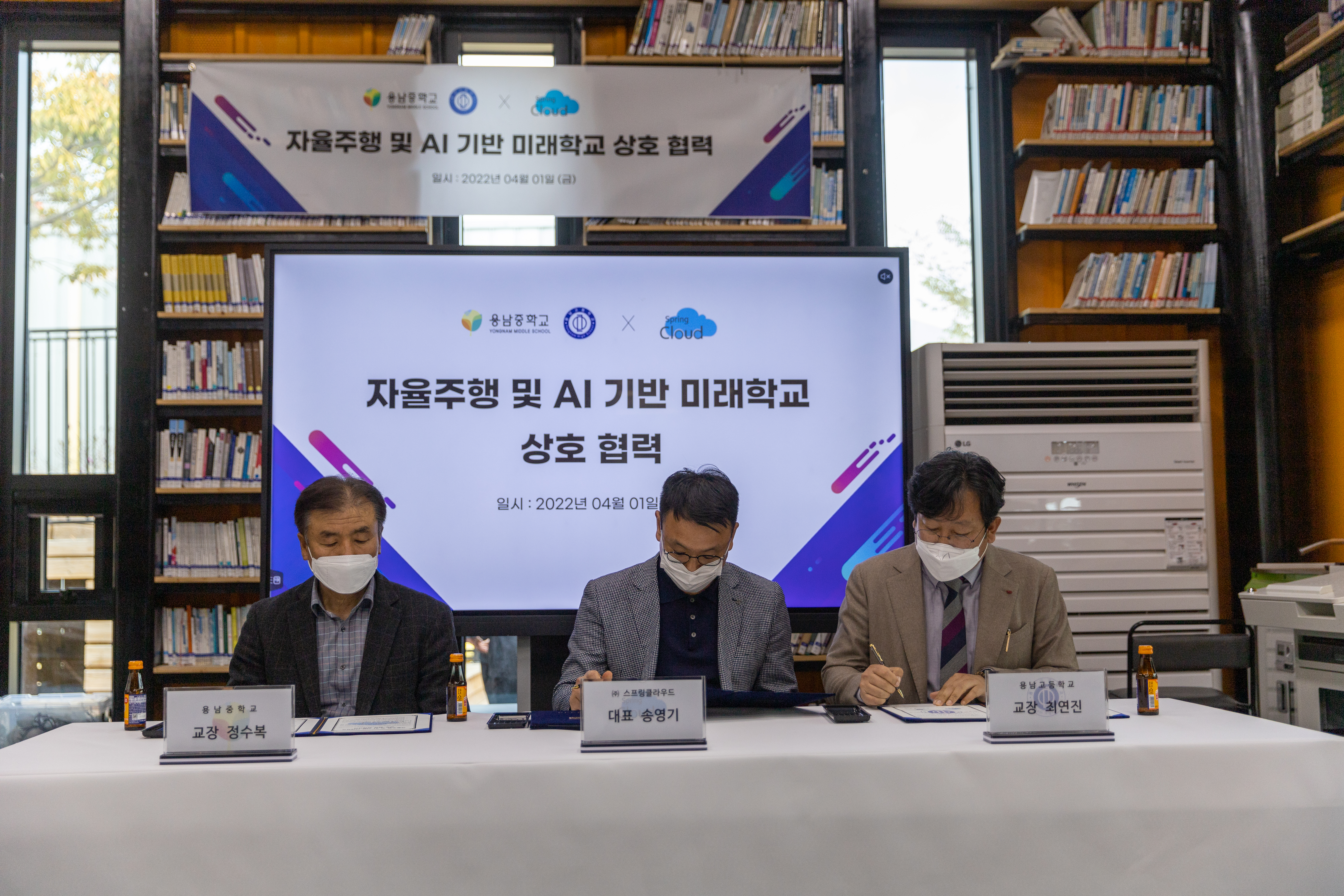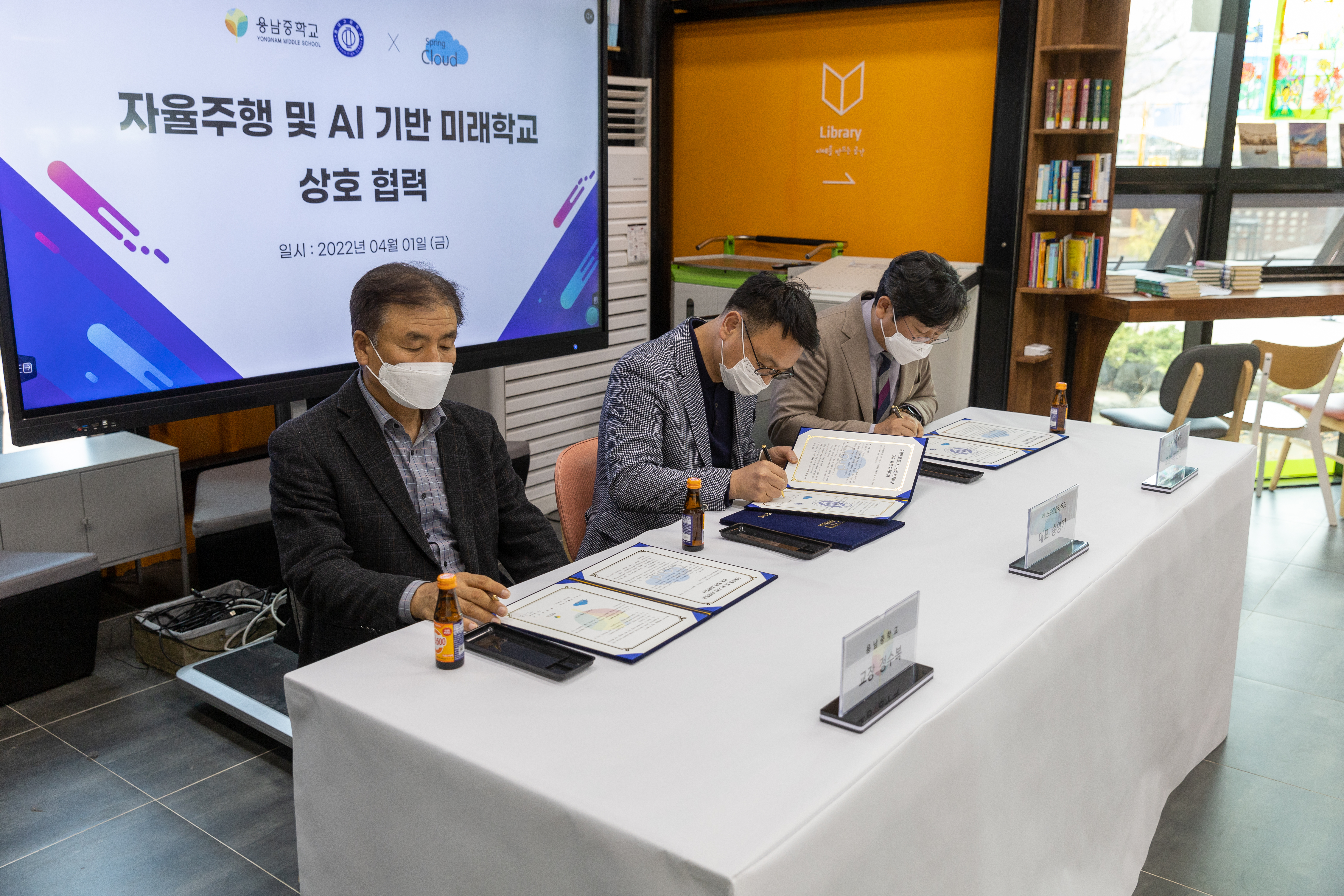 용남중·고등학교는 4월 1일 자율주행 및 AI 기반 미래학교 발전을 위해 ㈜스프링클라우드와 MOU를 체결하였습니다.