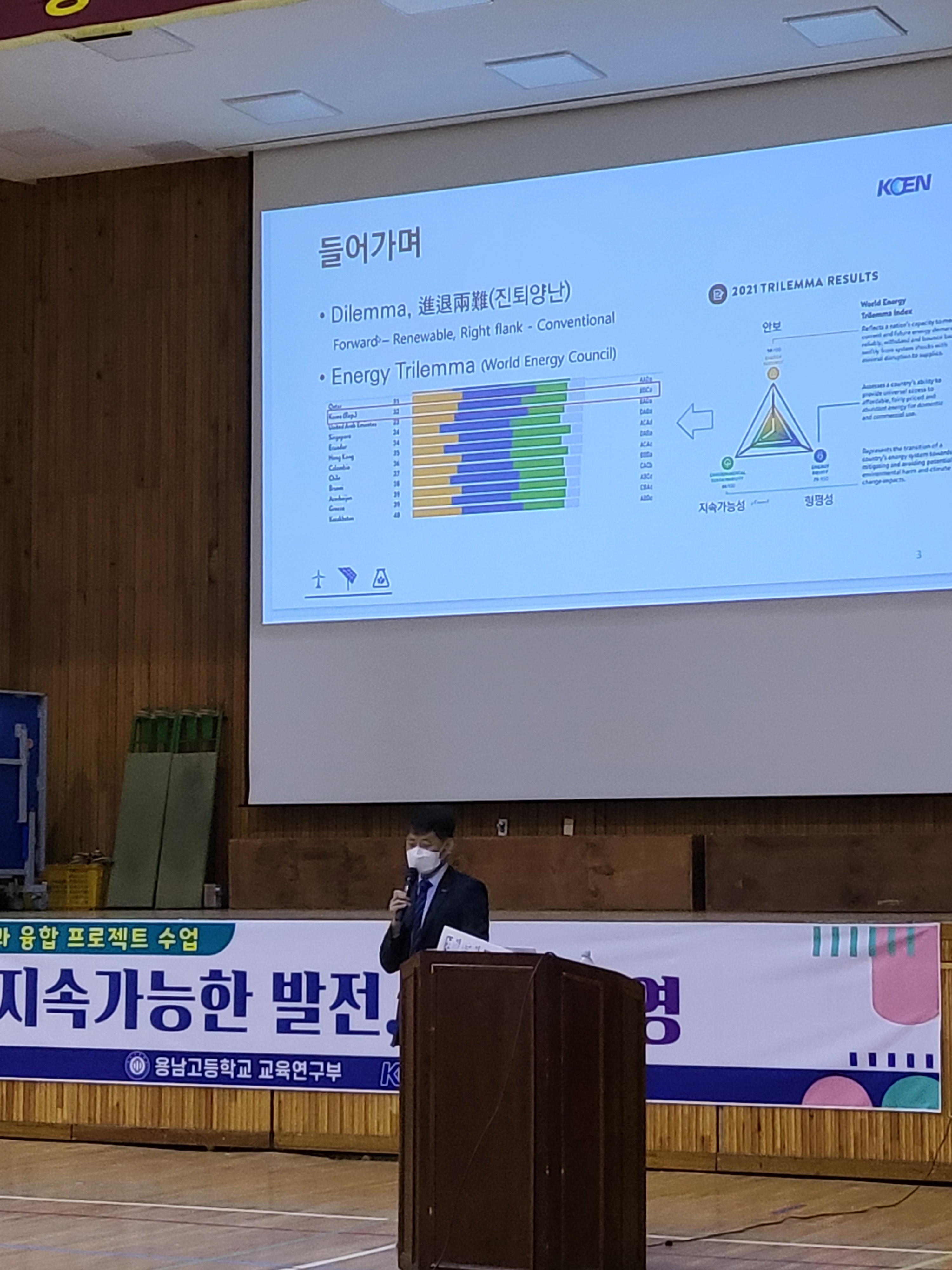 1. 일시 및 장소 : 2022.10.26.(수), 청룡관 2. 2학기 프로젝트 수업 중 '기업 지표로 보는 사회변화' 프로젝트와 '김이박의 미세먼지 상담소' 프로젝트와 연계되는 사전 활동으로 에너지 공기업인 '한국남동발전'에서 'ESG경영'의 주제로 초청 강연이 실시되었습니다. ESG 경영 실천의 배경과 ESG 경영 지배구조 및 한국남동발전에서 탄소중립을 위해 실천하고 있는 과제 및 발전소들의 모습을 강연을 통해 직접 듣고 질의 응답을 하는 시간을 가졌습니다.