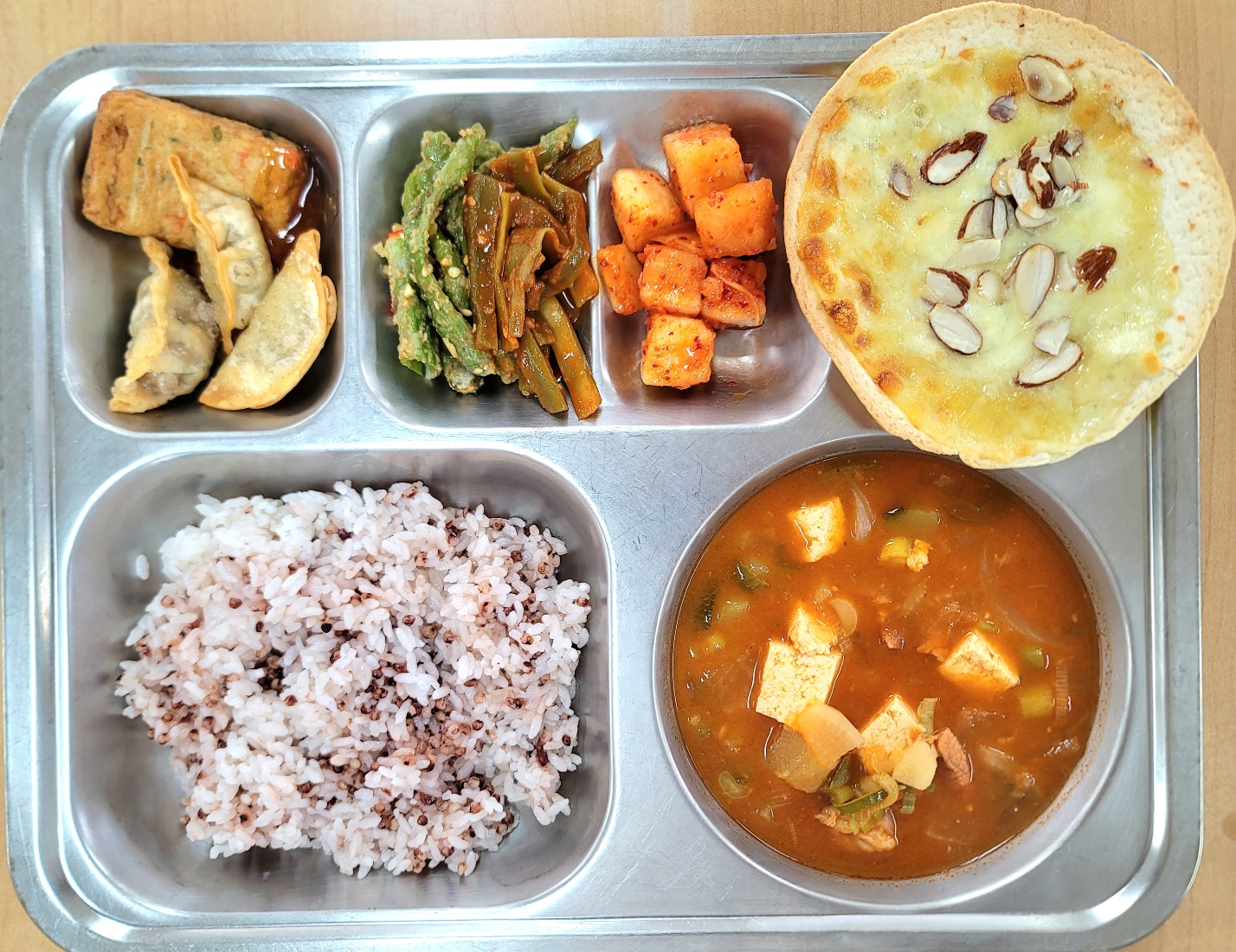 [중식] 차수수밥,돈육고추장찌개,멘보샤&어두부전,꽈리고추찜*양념장(자율),매콤궁채볶음(자율),깍두기,또띠아고르곤졸라피자