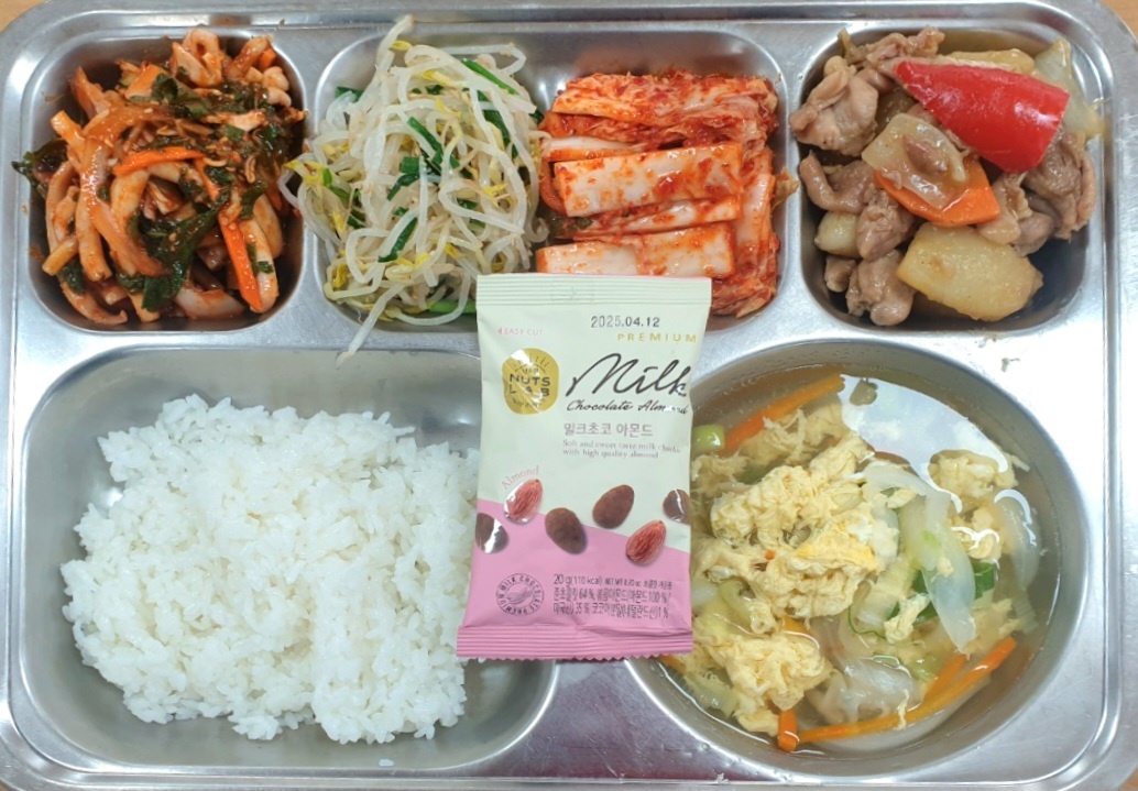 [조식] 친횐경찹쌀밥,물만두국,닭살간장조림,오징어초무침,부추숙주나물무침,배추김치,밀크초코아몬드
