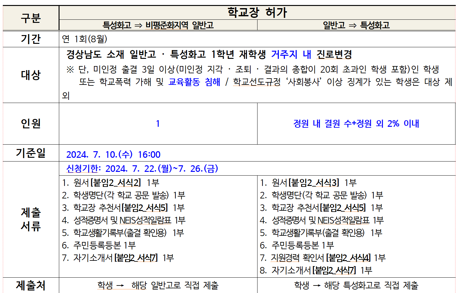 2024학년도 용남고등학교 진로변경 전입학제 계획 및 신청서식