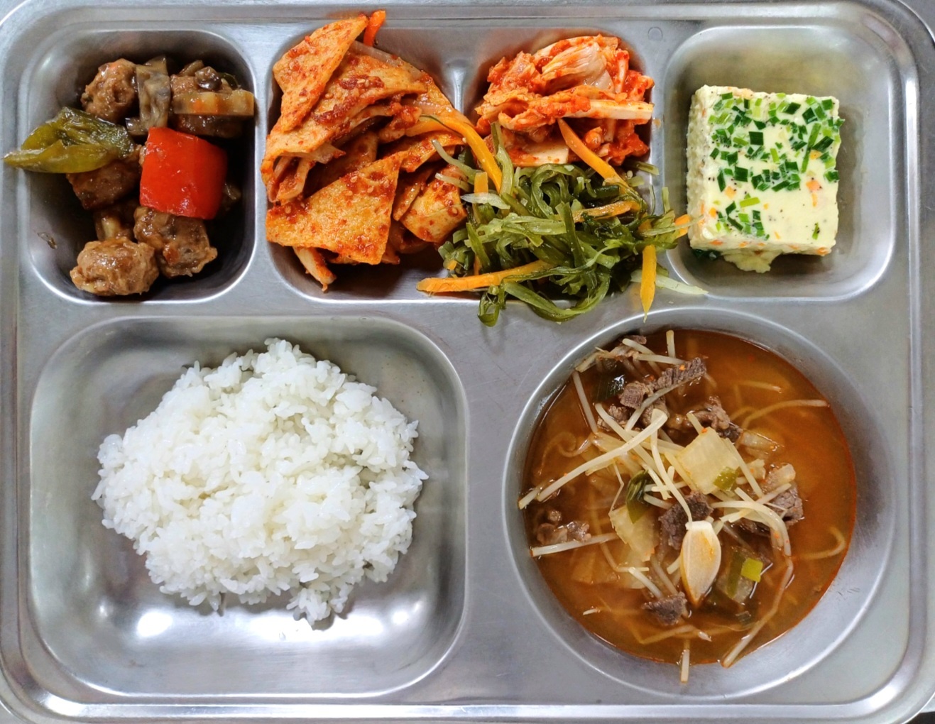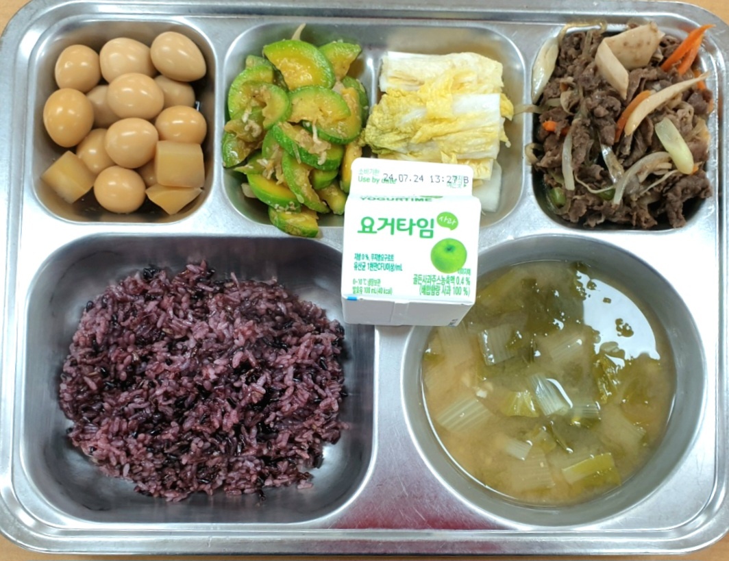 [조식] 찹쌀흑미밥,시락국,한우버섯당면볶음,메추리알곤약조림,애호박볶음(자율),백김치,요거타임