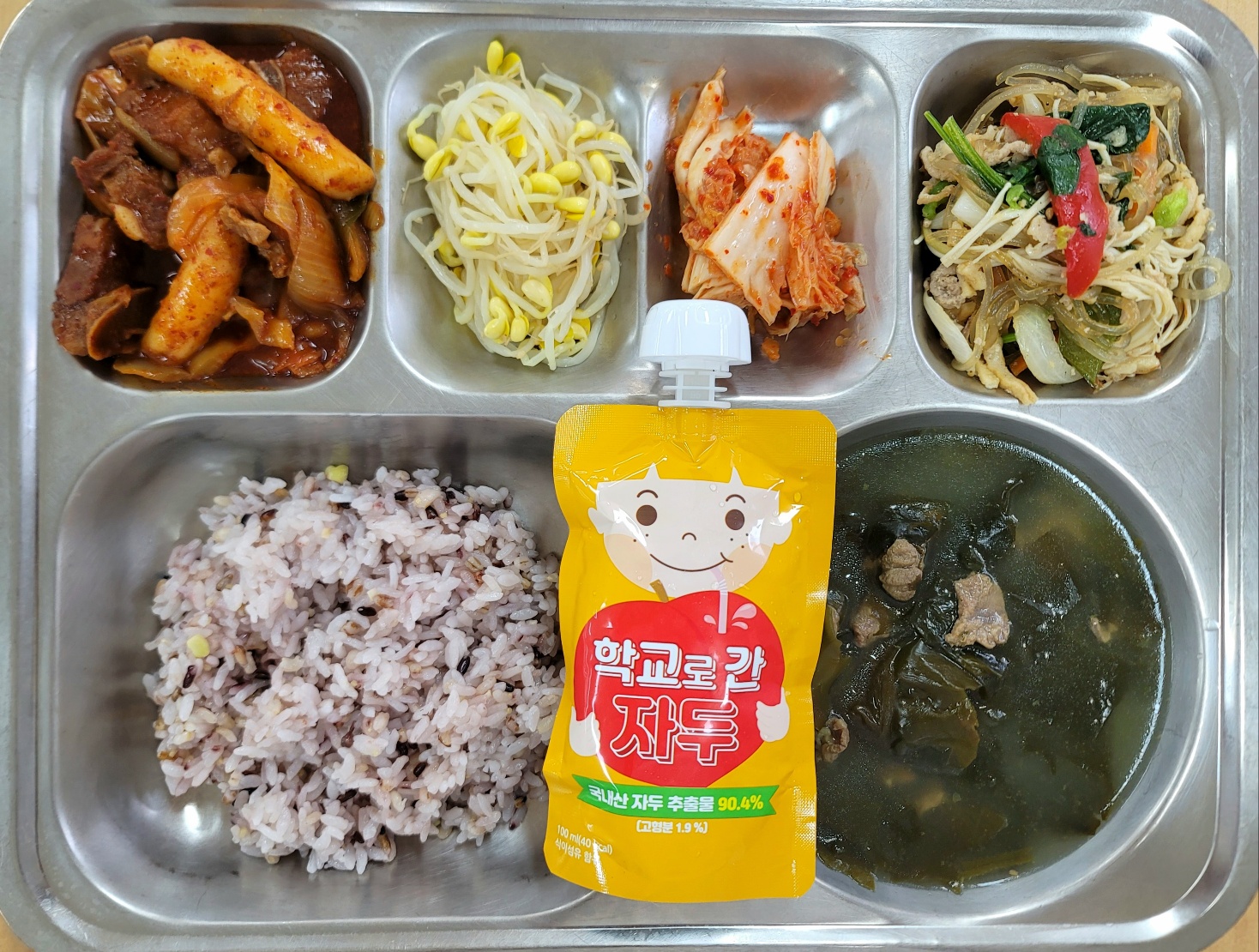 [중식] 친환경잡곡밥,쇠고기미역국,동인동식찜갈비,돈육버섯피망잡채,콩나물무침,배추김치,학교로간주스(자두)