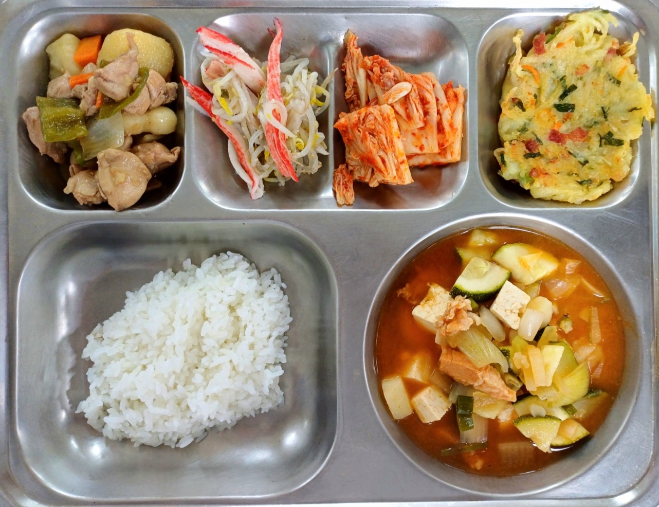[석식] 친환경찹쌀밥,돈육고추장찌개,닭살간장조림,베이컨감자채전,맛살숙주나물무침,배추김치