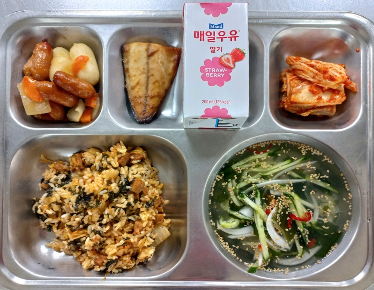 [조식] 김치스팸볶음밥,오이냉국,비엔나치즈떡조림,매실된장고등어구이,배추김치,딸기우유