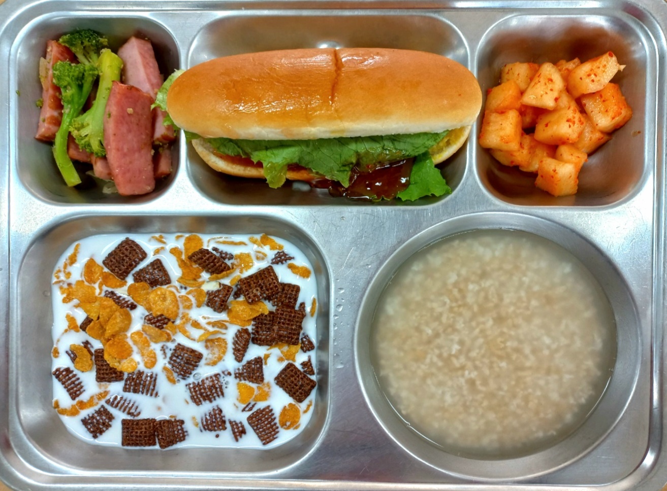 [조식] 칼집소시지핫도그,숭늉,브로콜리햄볶음,깍두기,시리얼,우유
