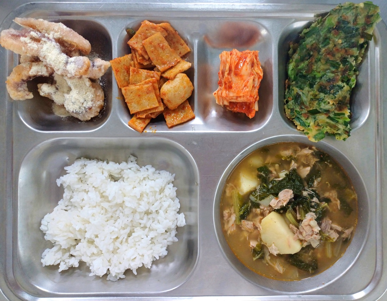[석식] 친환경찹쌀밥,순살등뼈감자탕,마블오징어채우라이,건새우부추전,매콤어묵볶음,배추김치,거꾸로요구르트