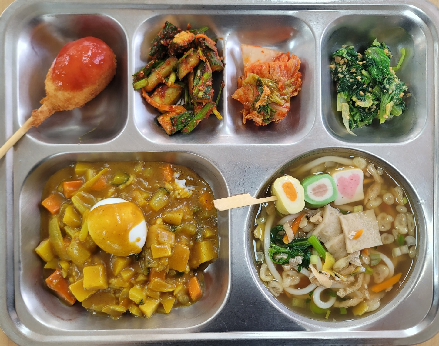 [중식] 에그인카레,어묵꼬치우동,단배추된장나물,오이소박이(자율),배추김치,미니통치즈핫도그*케첩