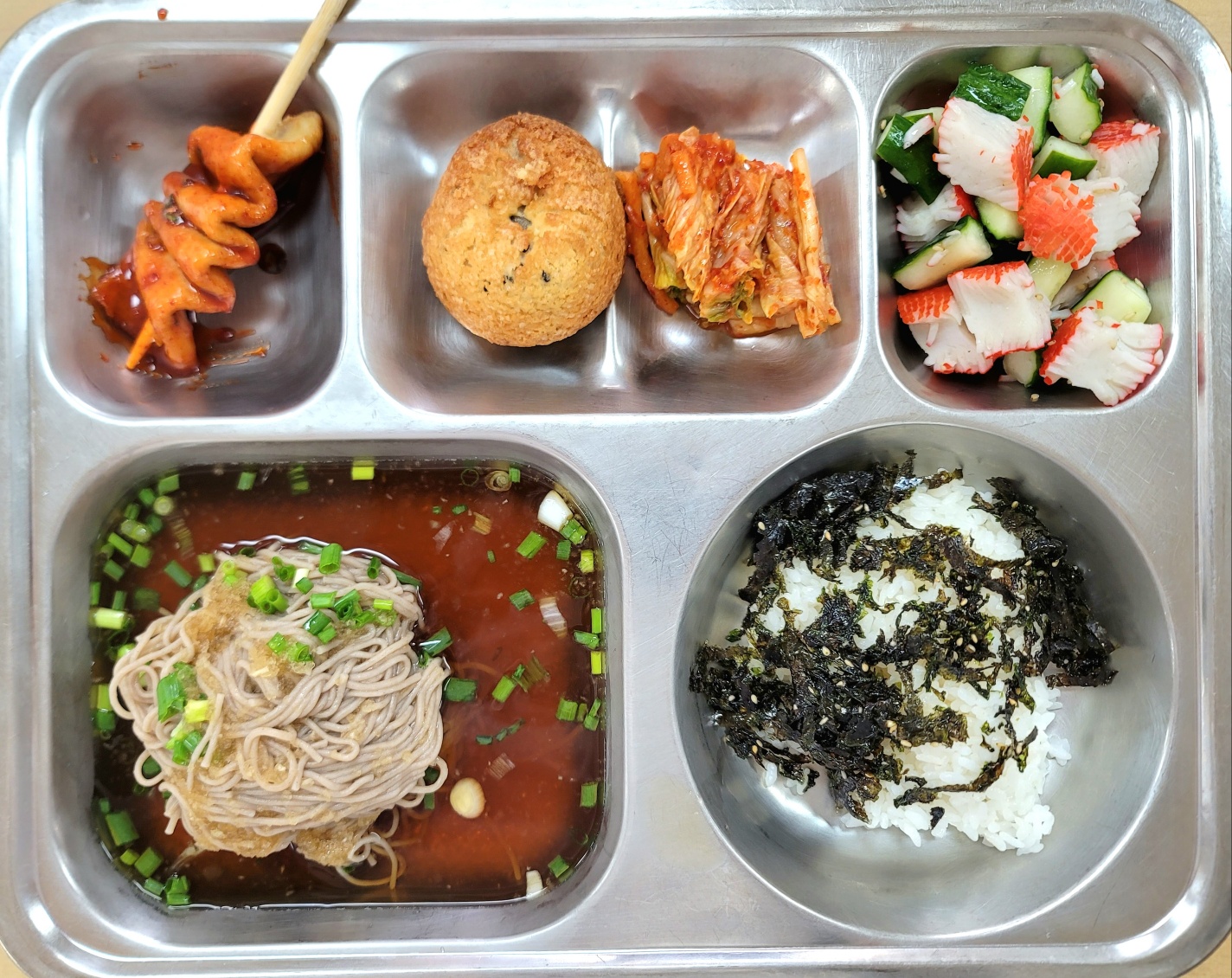 [석식] 미니밥*파래자반,냉모밀소바,매운꼬치어묵,오이꽃맛살냉채,배추김치,달콤바삭찰보루빵