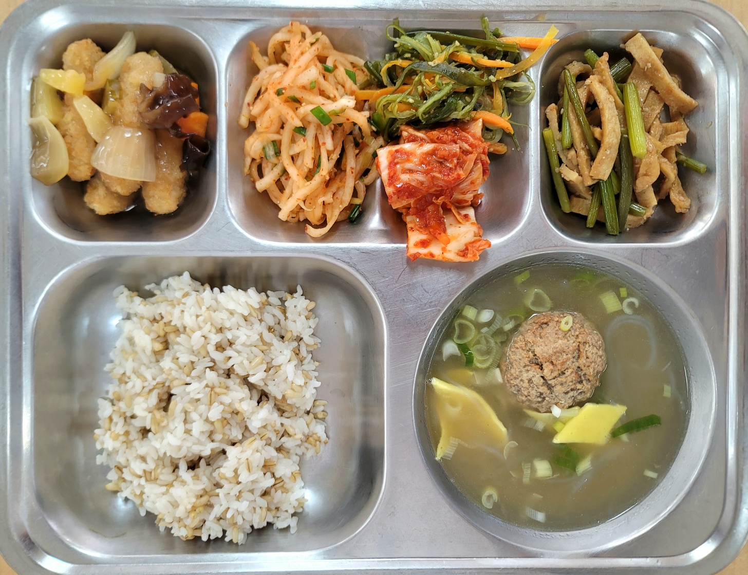 [중식] 건강귀리밥,진한고기완탕,스틱카츠탕수육,마늘쫑어묵볶음,잔파무생채,미역줄기볶음(자율),배추김치