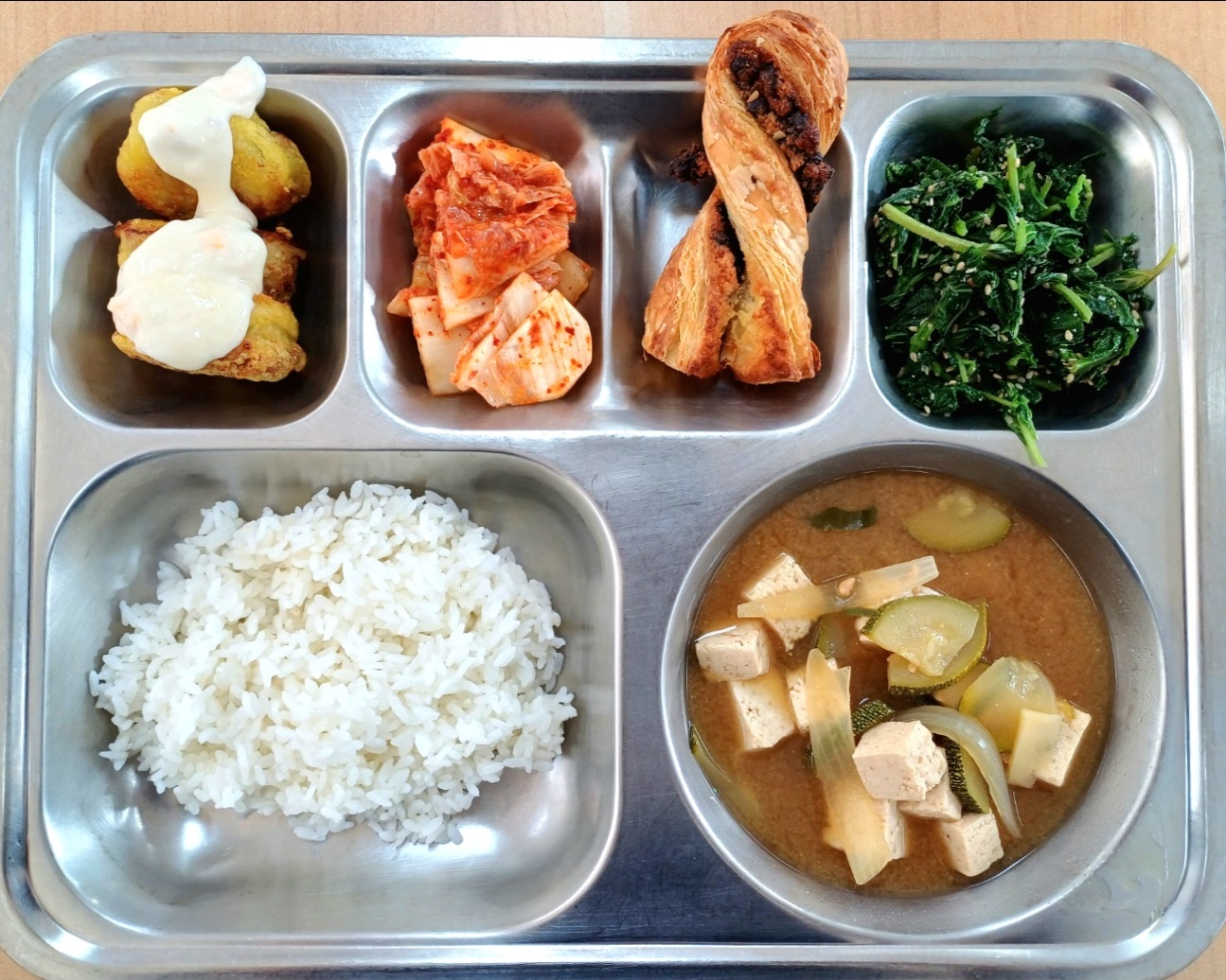 [조식] 친환경찹쌀밥,두부된장국,청양갈릭고기튀김,깨순나물,배추김치초코칩트위스트파이