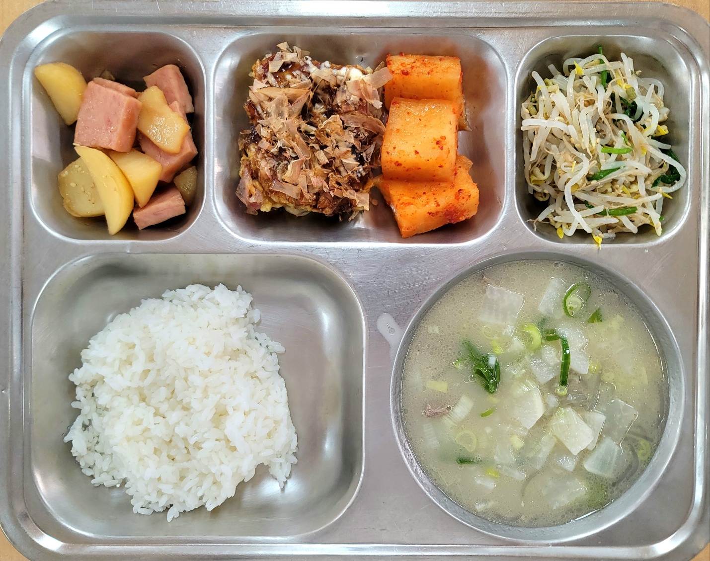 [석식] 친환경찹쌀밥,나주한우곰탕,오꼬노미야끼,햄감자조림,부추숙주나물무침,섞박지(완제)