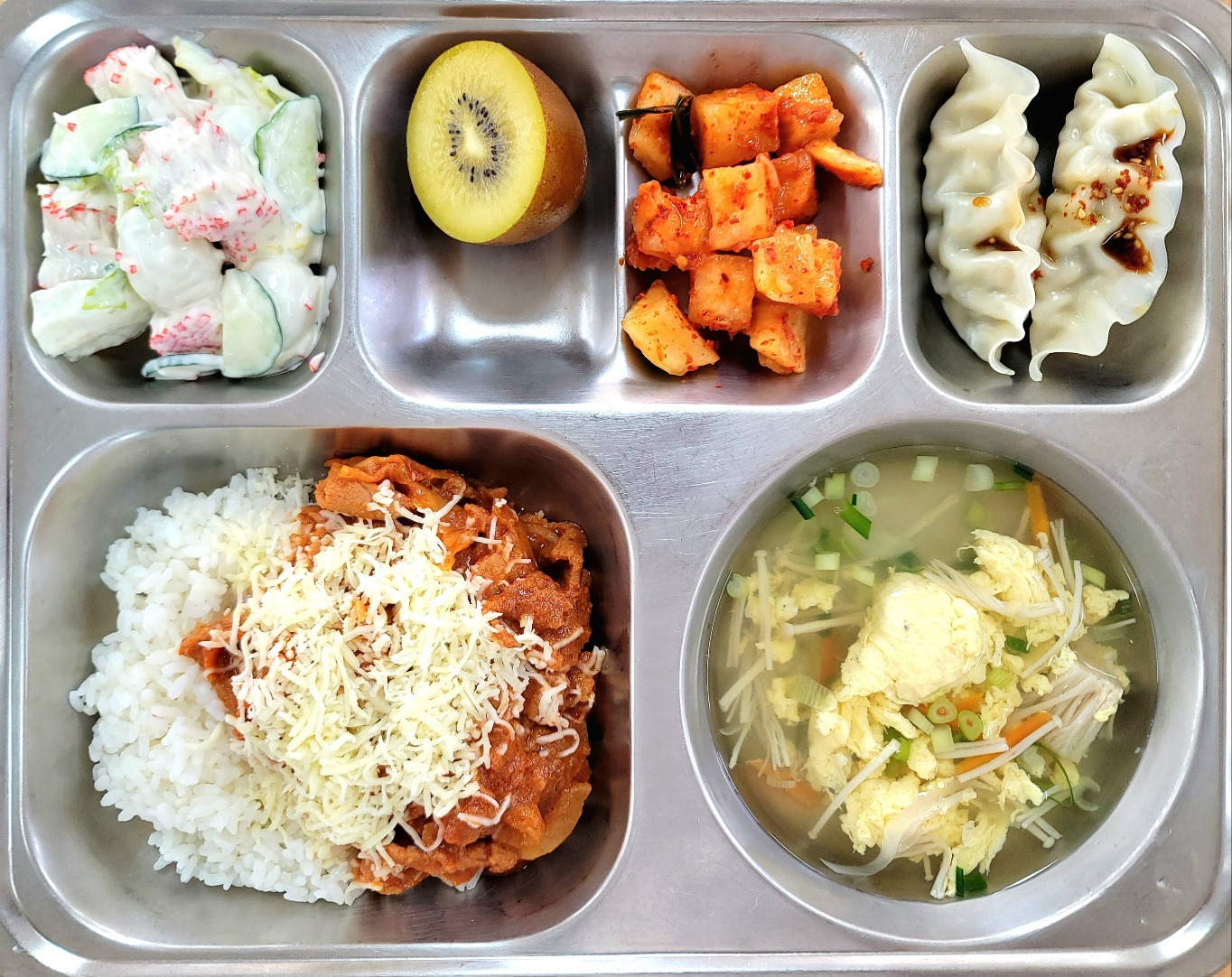 [중식] 눈꽃치즈제육덮밥,팽이버섯계란국,왕교자찐만두,꽃맛살샐러드,깍두기,골드키위