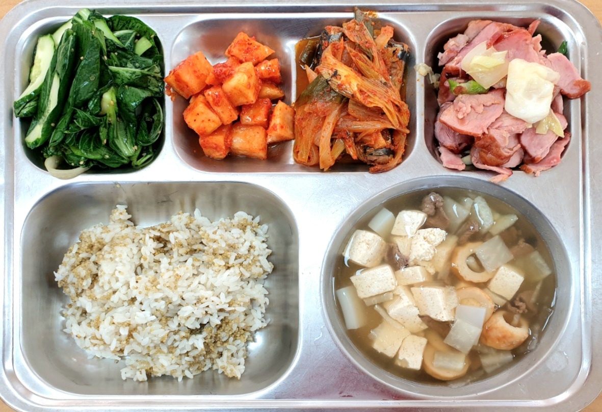 [조식] 차조밥,쇠고기탕국,연잎돼지순살야채볶음,신김치꽁치조림(자율),청경채겉절이,깍두기