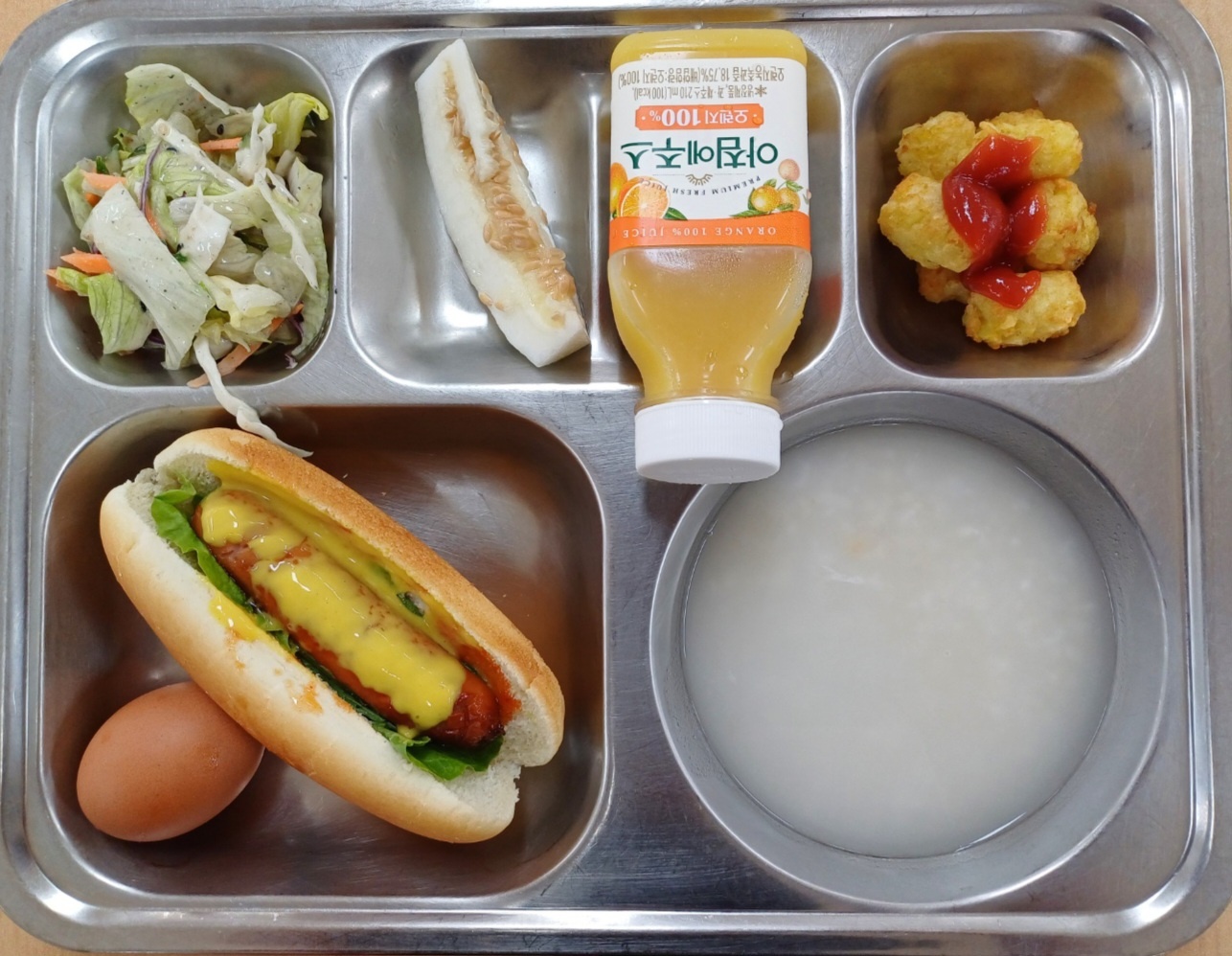 [조식] 칼집소시지핫도그,숭늉,삶은달걀,맛감자튀김*케첩,양상추샐러드/흑깨D,참외,오렌지주스