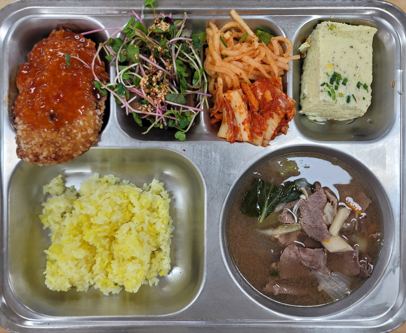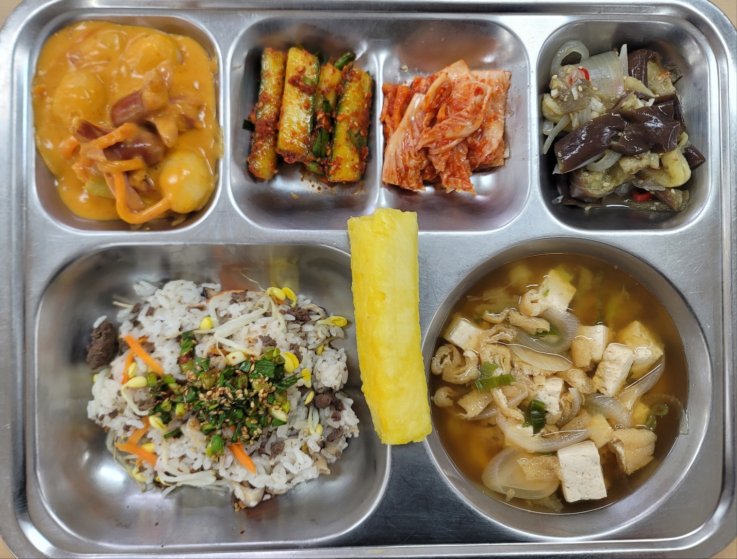 [중식] 쇠고기콩나물밥*양념장,유부장국,로제치즈쏙옹볶이,오이소박이,가지나물무침(자율),배추김치,파인애플