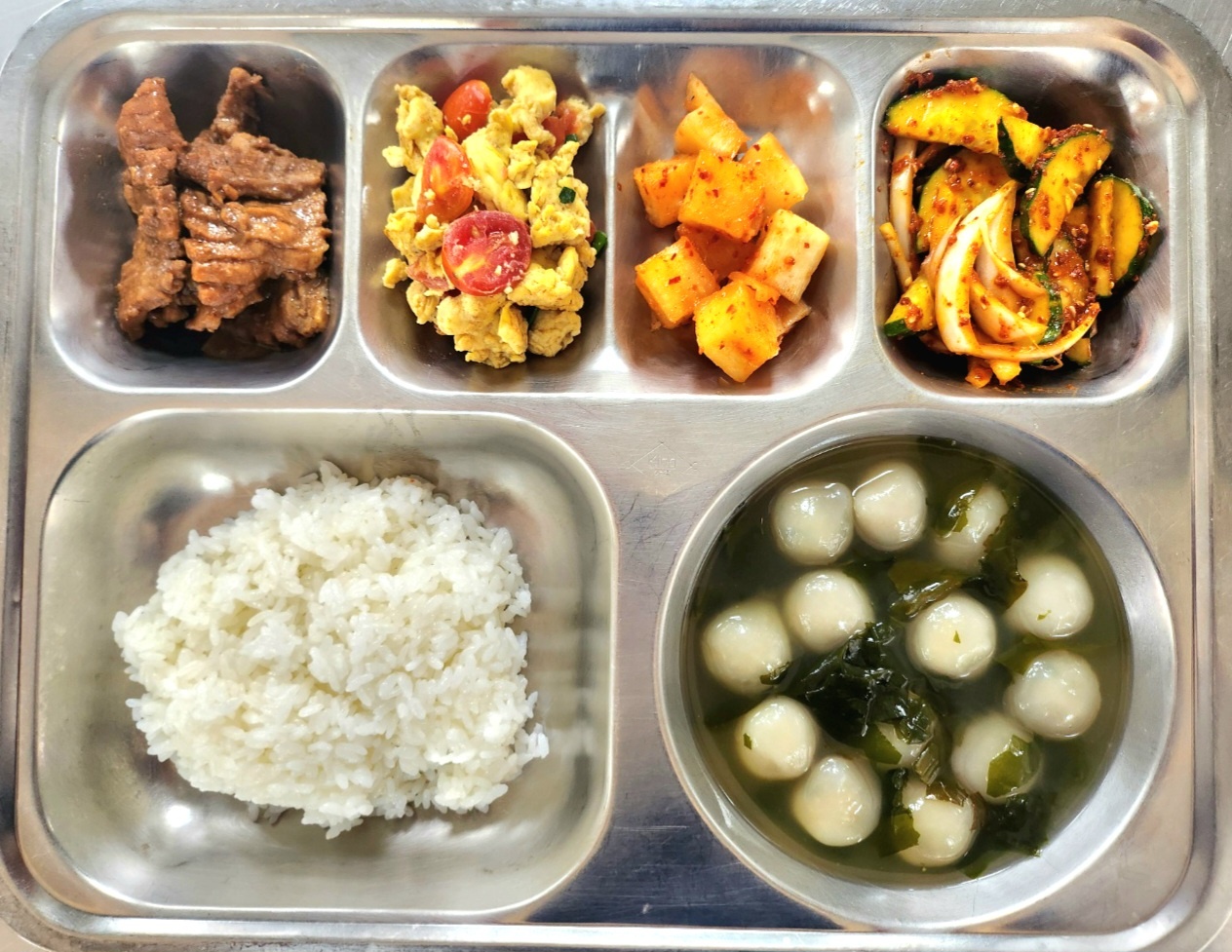 [조식] 친환경찹쌀밥,새알심만두미역국,칼지순살돼지갈비맛구이,토마토달걀볶음,오이양파무침,깍두기