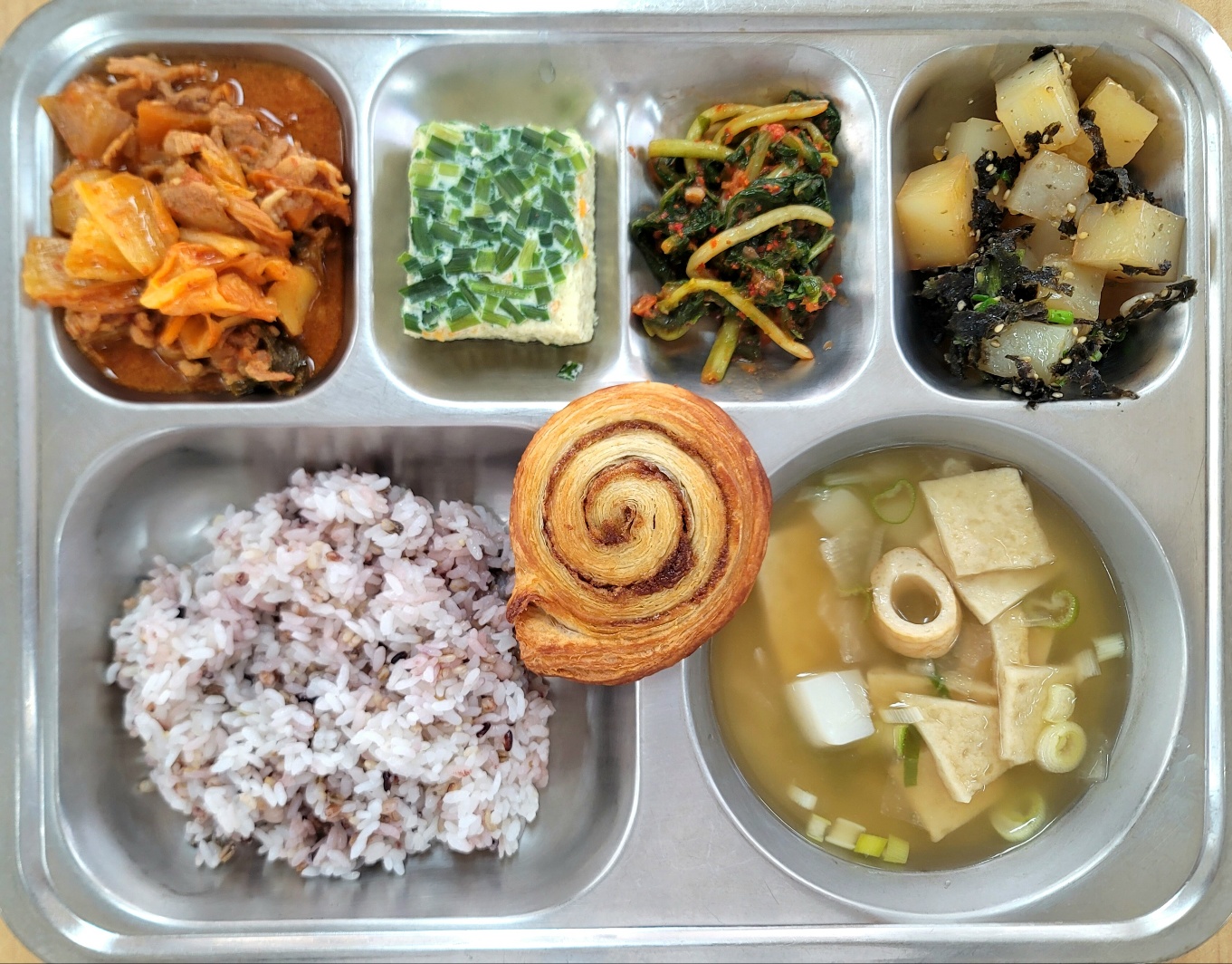[중식] 친환경잡곡밥,모듬어묵국,돈육김치볶음,계란찜,청포묵무침,열무김치,미니시나몬스윌
