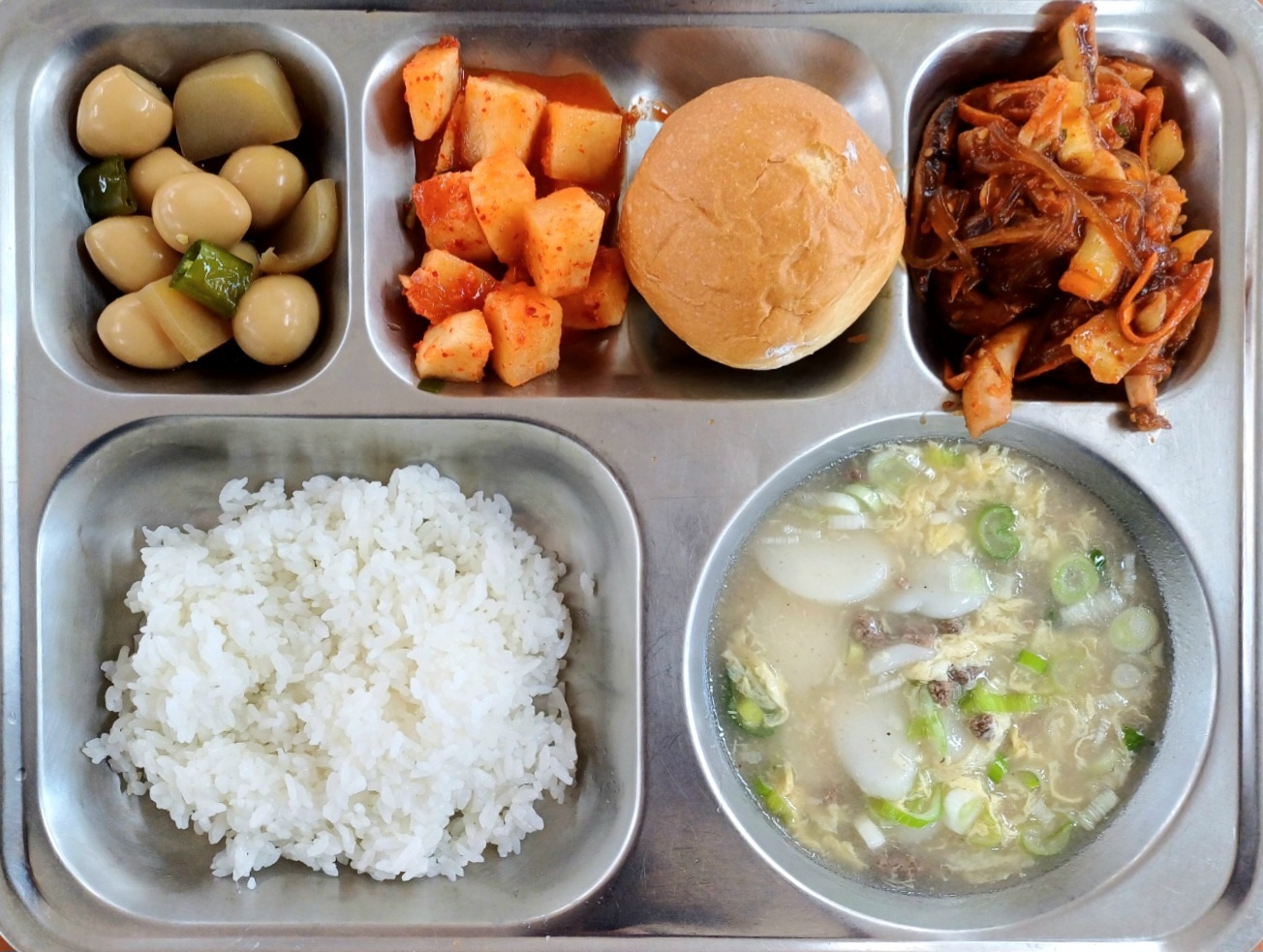 [조식] 미니밥(자율),쇠고기떡국,오징어당면볶음,메추리알곤약조림,깍두기,우유생크림빵