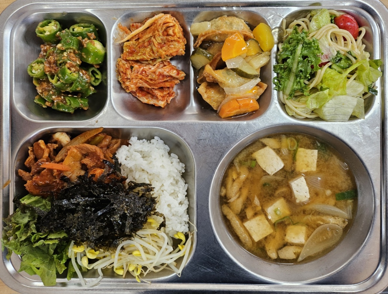 [중식] 돈육쭈꾸미덮밥,유부장국,스파게티샐러드,탕수만두,아삭고추된장무침,배추김치