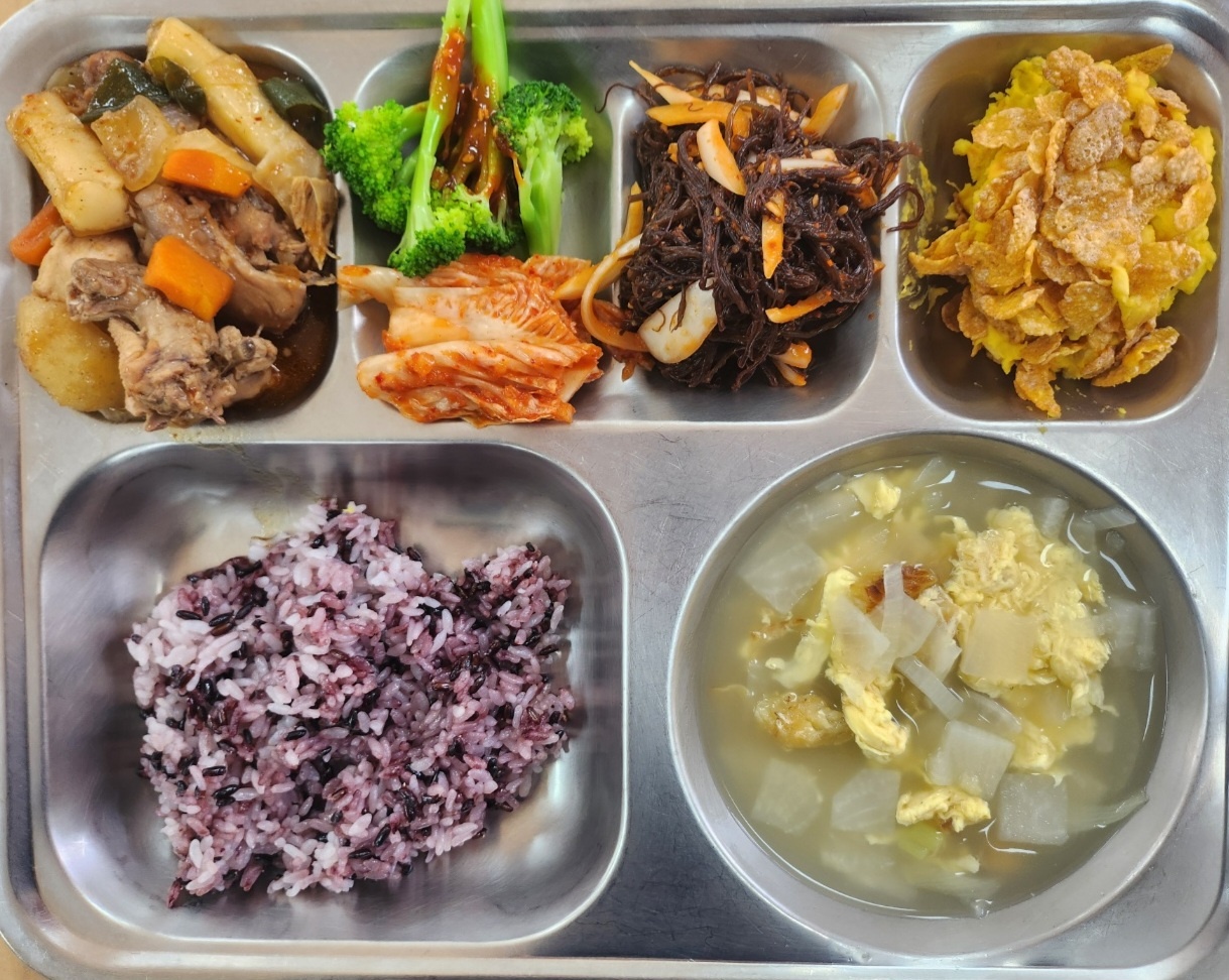 [석식] 찹쌀흑미밥,황태계란국,분모자안동찜닭,단호박고구마범벅,브로콜리&초장(자율),꼬시래기무침(자율),배추김치