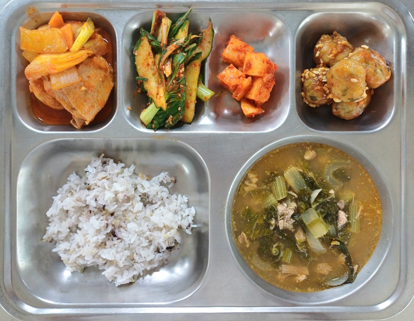 [석식] 친환경잡곡밥,사골우거지국,묵은지닭볶음탕,굴림만두강정,청경채겉절이,깍두기