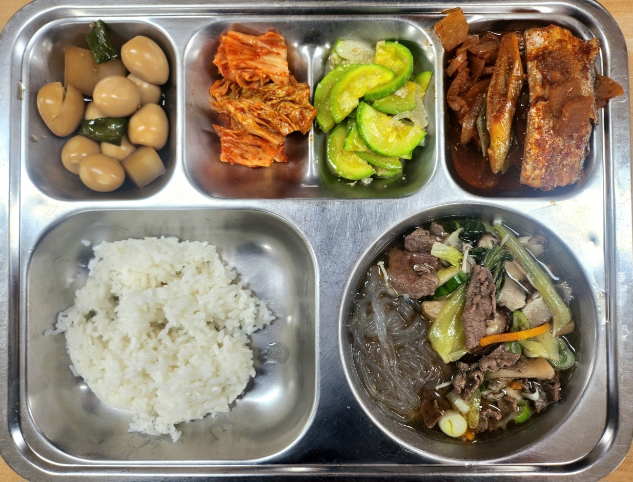 [조식] 친환경찹쌀밥,한우버섯전골*당면사리,갈치무조림,메추리알곤약조림,애호박볶음(자율),배추김치