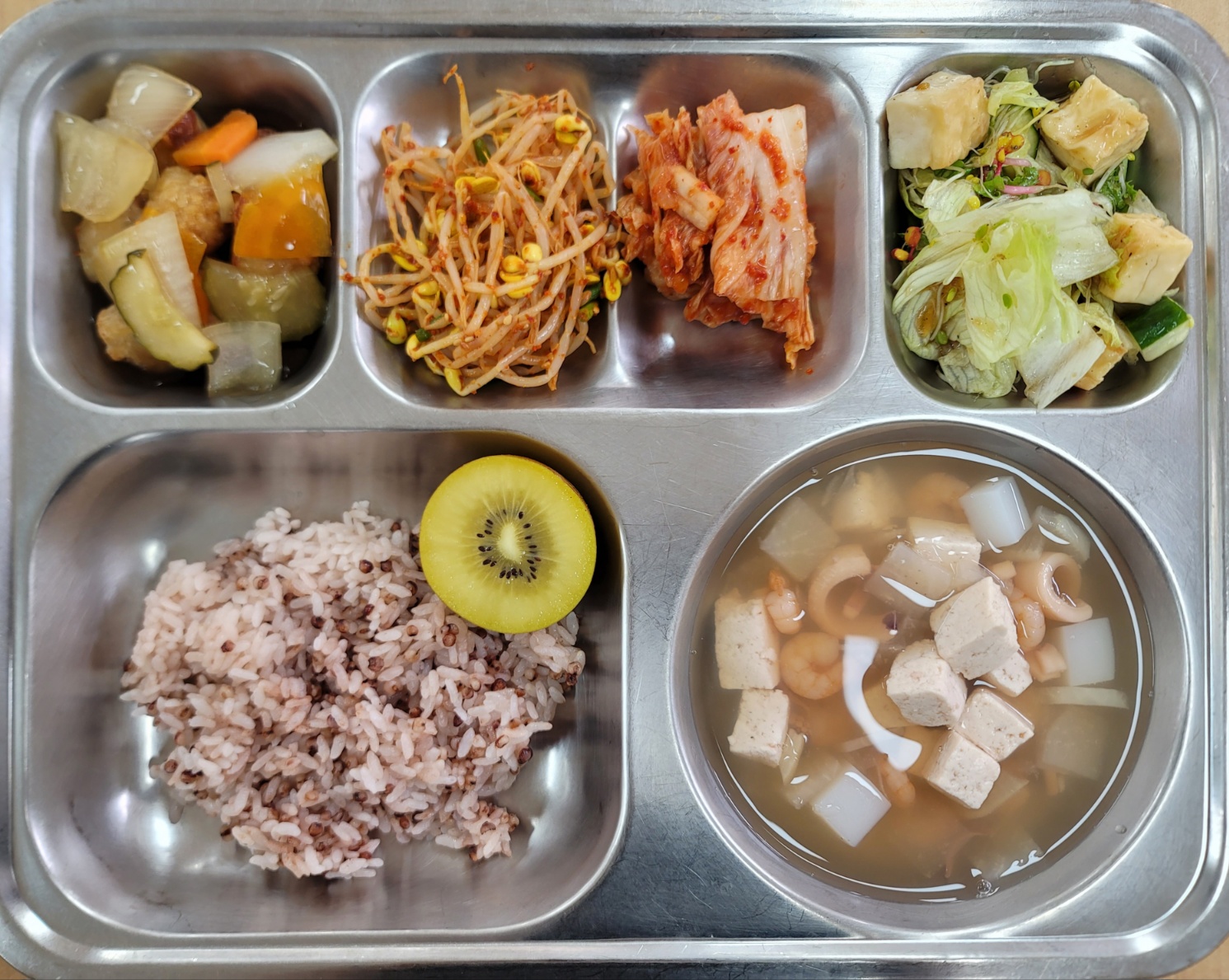 [중식] 차수수밥,맑은두부탕국,목화솜탕수육,두부샐러드,매콤콩나물무침,배추김치,골드키위