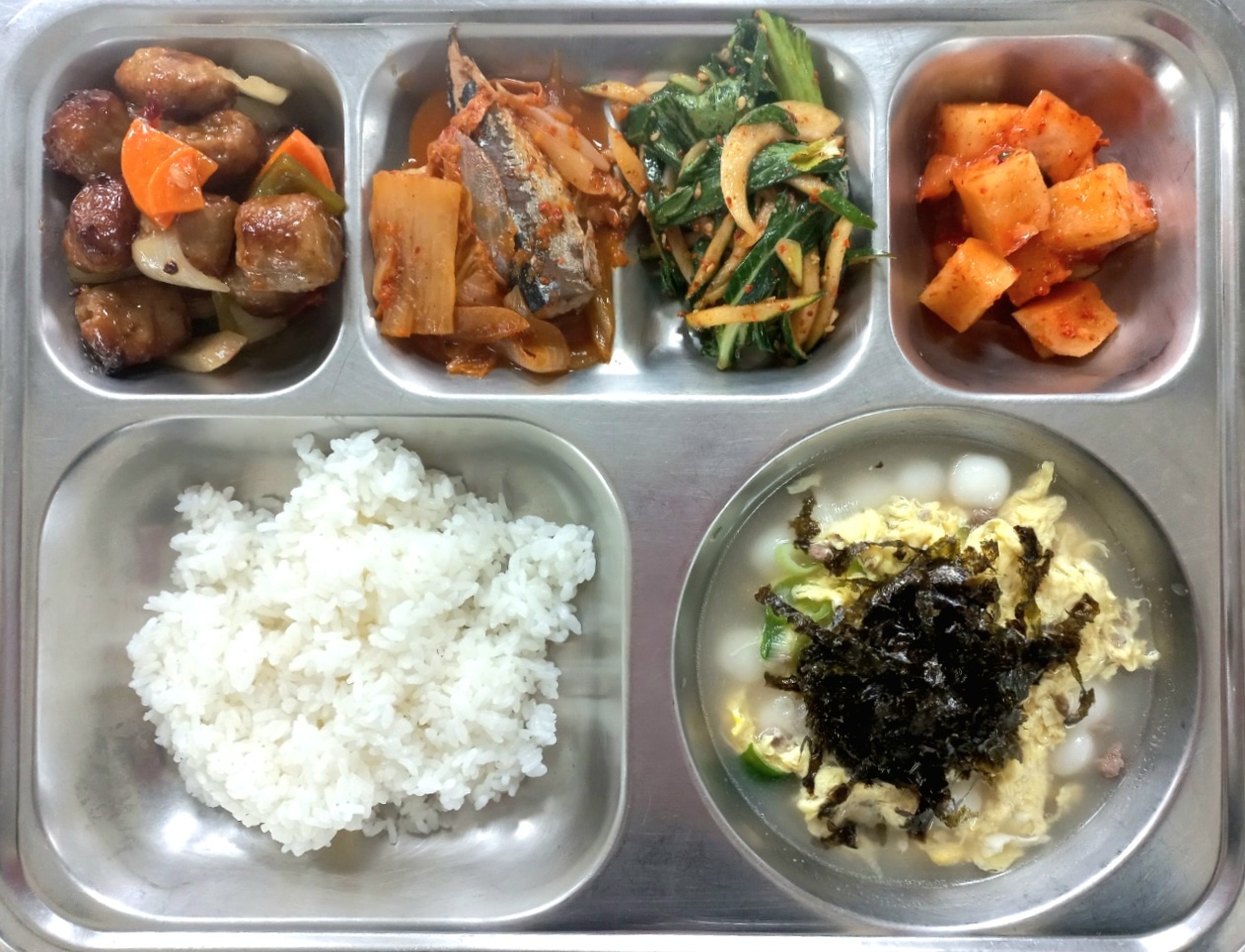 [조식] 친환경찹쌀밥,조랭이떡국,미트볼칠리소스볶음,신김치꽁치조림(자율),청경채겉절이,깍두기