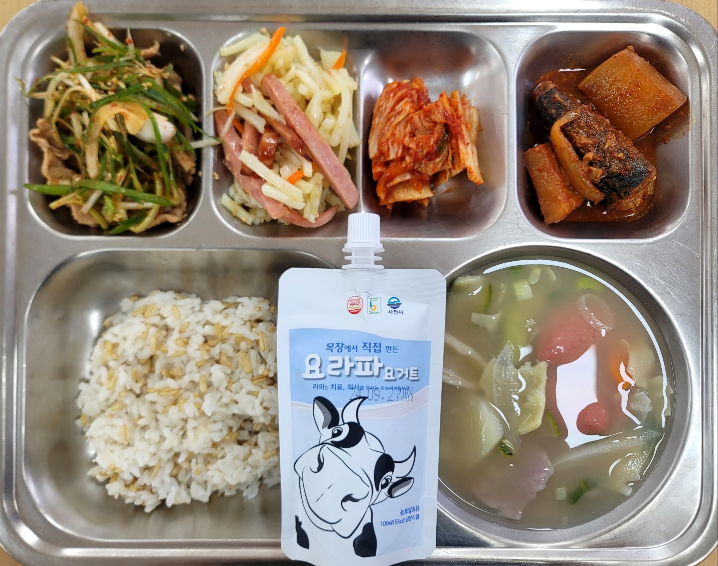 [중식] 건강귀리밥,삼색감자수제비국,바싹간장불고기*파채,고등어무조림(자율),햄감자채볶음,배추김치,요라파요거트