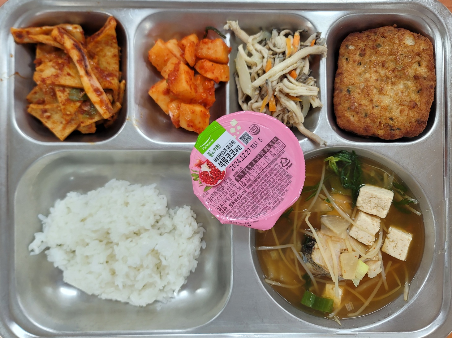 [석식] 친환경찹쌀밥,얼큰동태국,고기완자전,충무식오징어어묵볶음,애느타리버섯볶음(자율),깍두기,석류코코푸딩