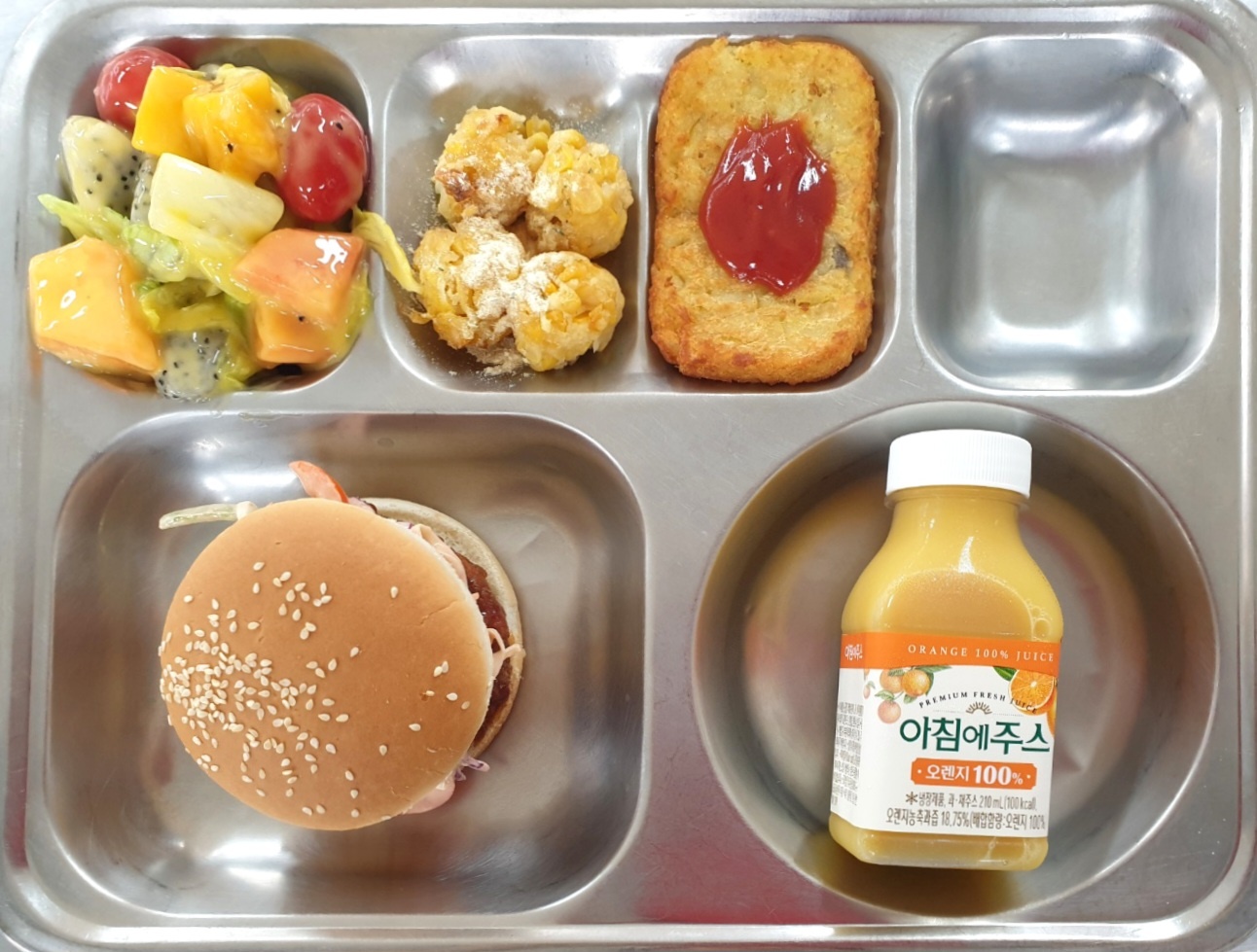 [조식] 에그토르티아버거,리얼콘볼,열대과일샐러드,해쉬브라운/케첩,오렌지주스