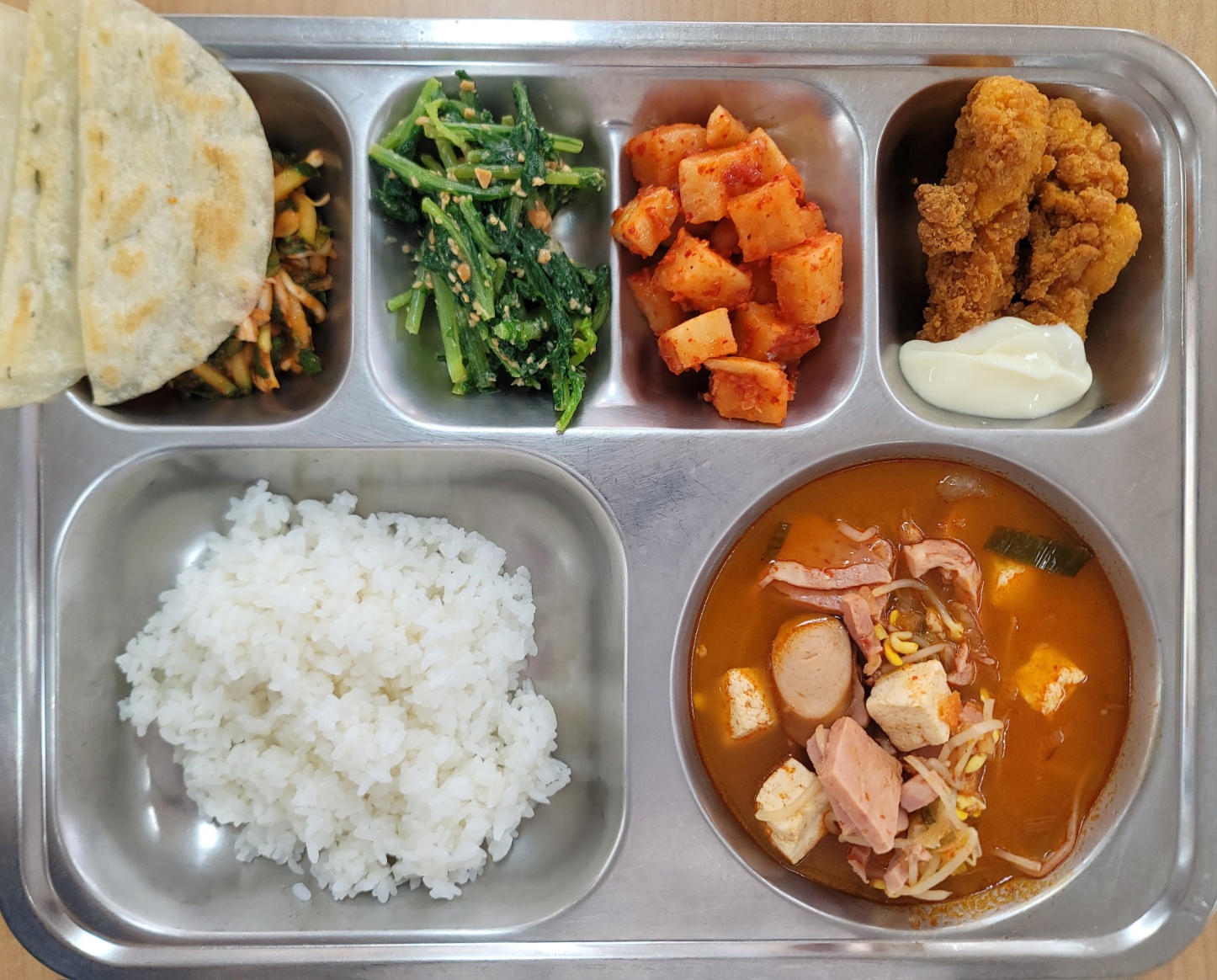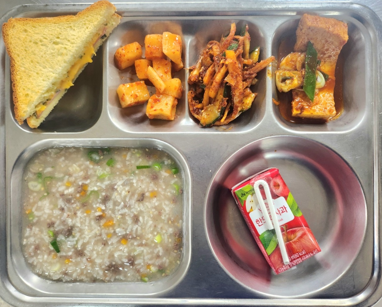 [조식] 쇠고기야채죽,대파크로크무슈,두부조림,도라지오이무침(자율),사과한모금,깍두기[중식] 친환경찹쌀밥,부대찌개,치킨텐더*화이트소스,납작만두*야채,열무된장나물,깍두기
