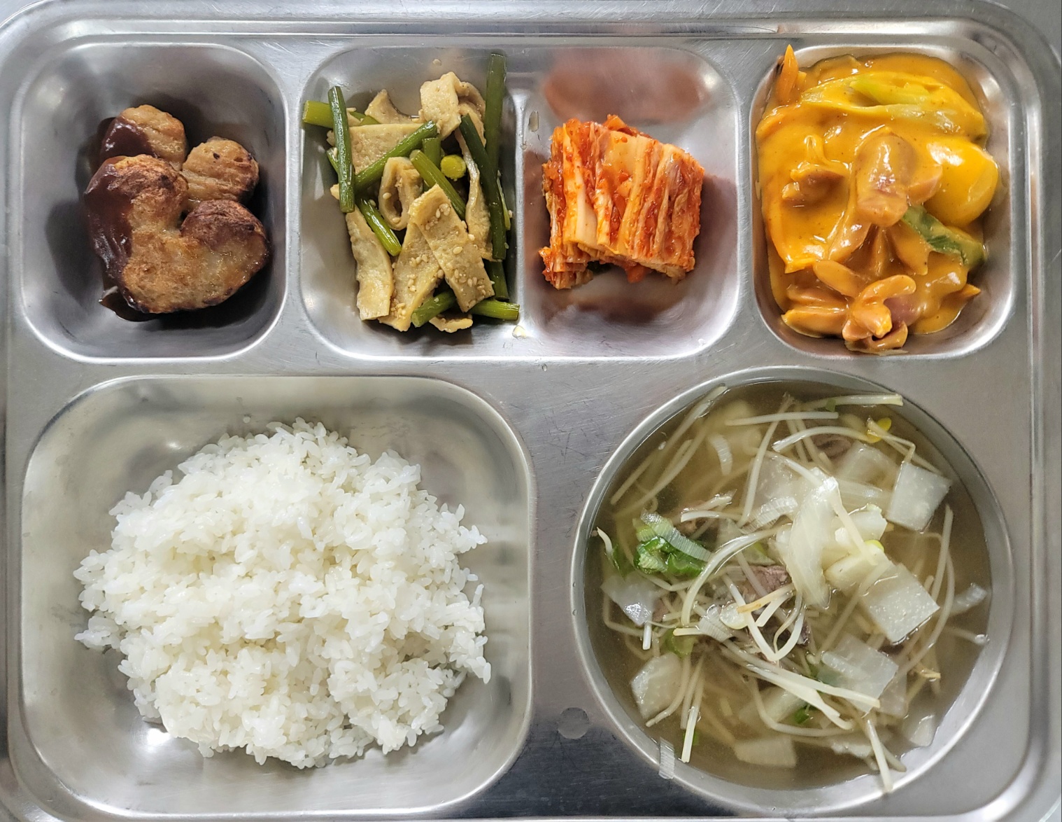 [중식] 쇠고기콩나물밥*양념장,시락국,동인동식찜갈비,찹쌀고구마치즈볼,맛살미역줄기볶음,깍두기,학교로간주스