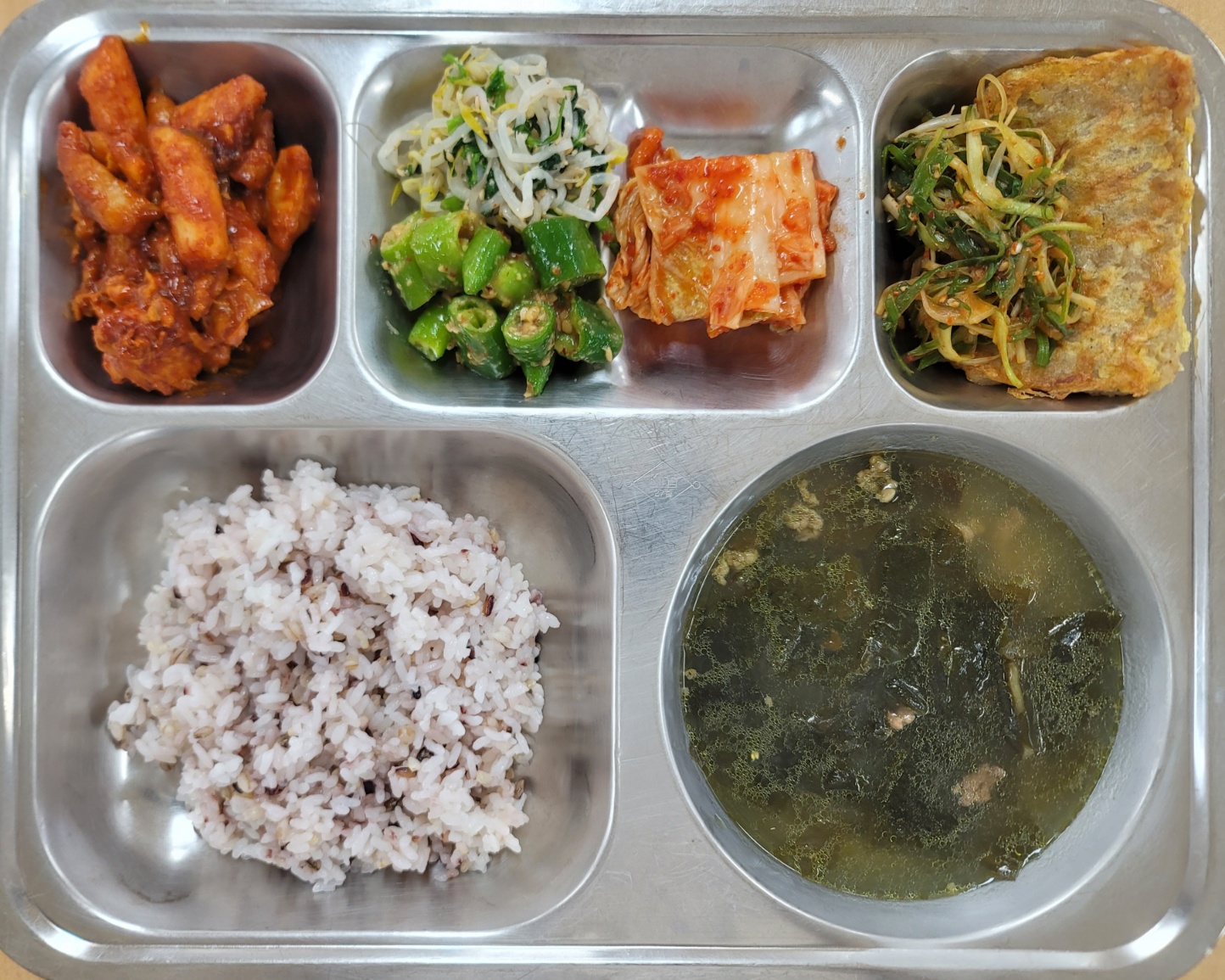 [중식] 친환경잡곡밥,쇠고기미역국,맵코바치킨,육전*파채무침,미나리숙주나물무침,아삭고추된장무침(자율),배추김치