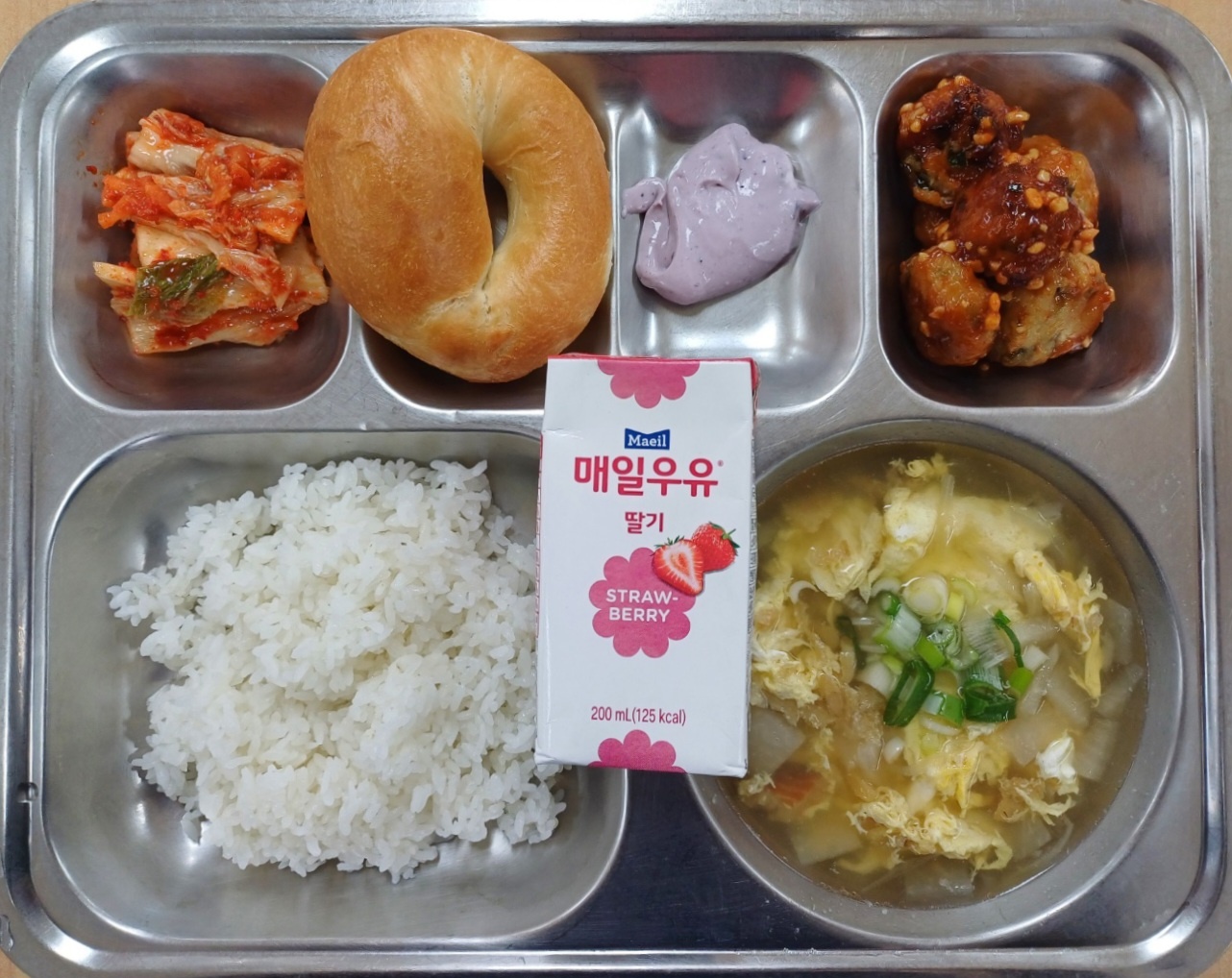 [조식] 친환경찹쌀밥,황태계란국,굴림만두강정,배추김치,베이글*크림치즈,딸기우유