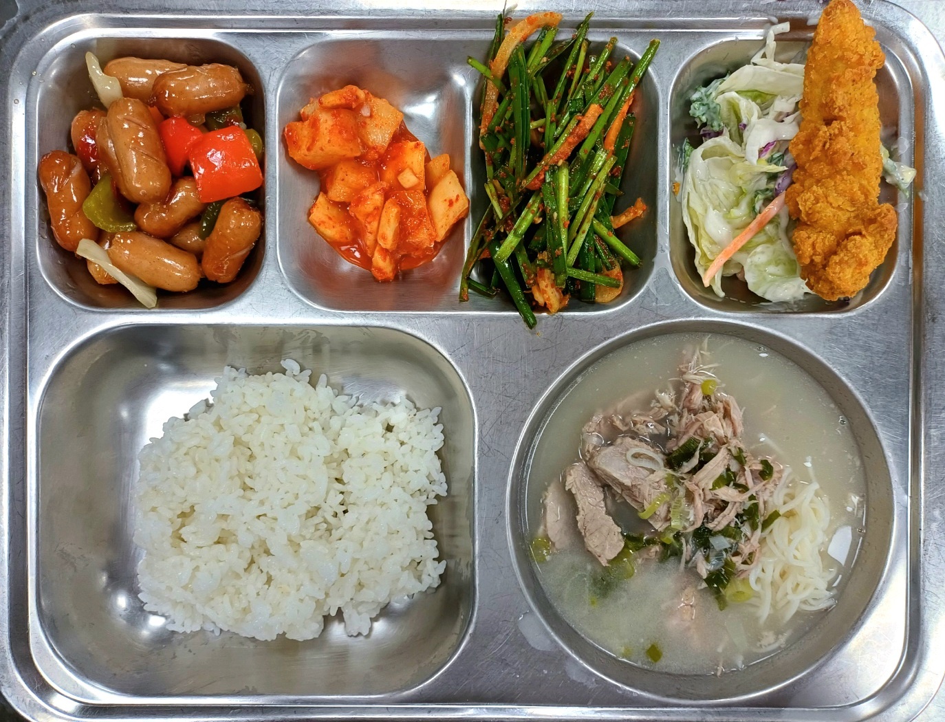 [석식] 친환경찹쌀밥,돼지국밥*소면,비엔나야채볶음*칠리S,치킨텐더샐러드,부추샐러드,깍두기