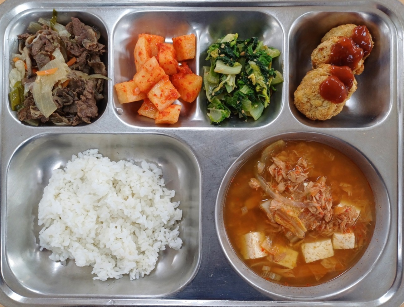 [조식] 친환경찹쌀밥,참치김치찌개,한우버섯당면볶음,한입쏙까스,단배추된장나물,깍두기