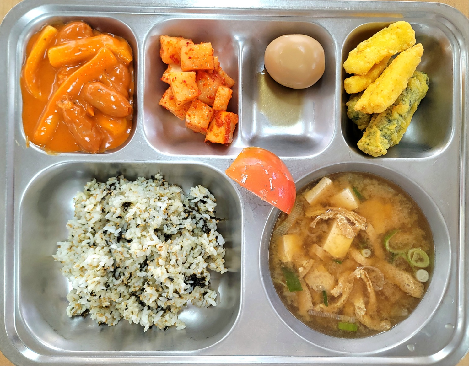 [중식] 후리카케김가루밥,유부장국,매콤로제떡볶이,달걀장조림,김말이&한입오징어튀김,깍두기,토마토꿀절임