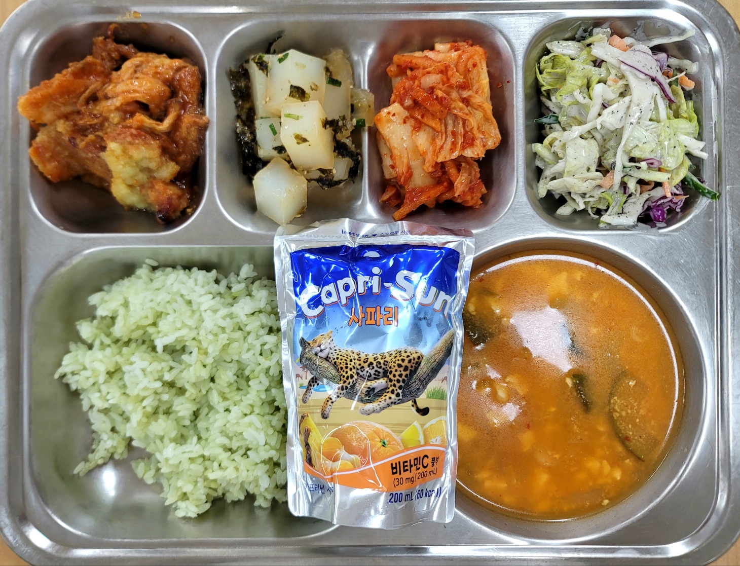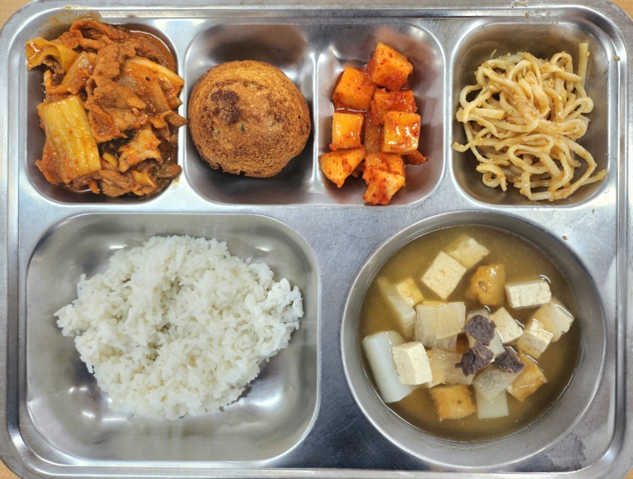 [조식] 친환경찹쌀밥,쇠고기탕국,돈육김치볶음,일미채간장볶음,깍두기,달콤바삭찰보루빵