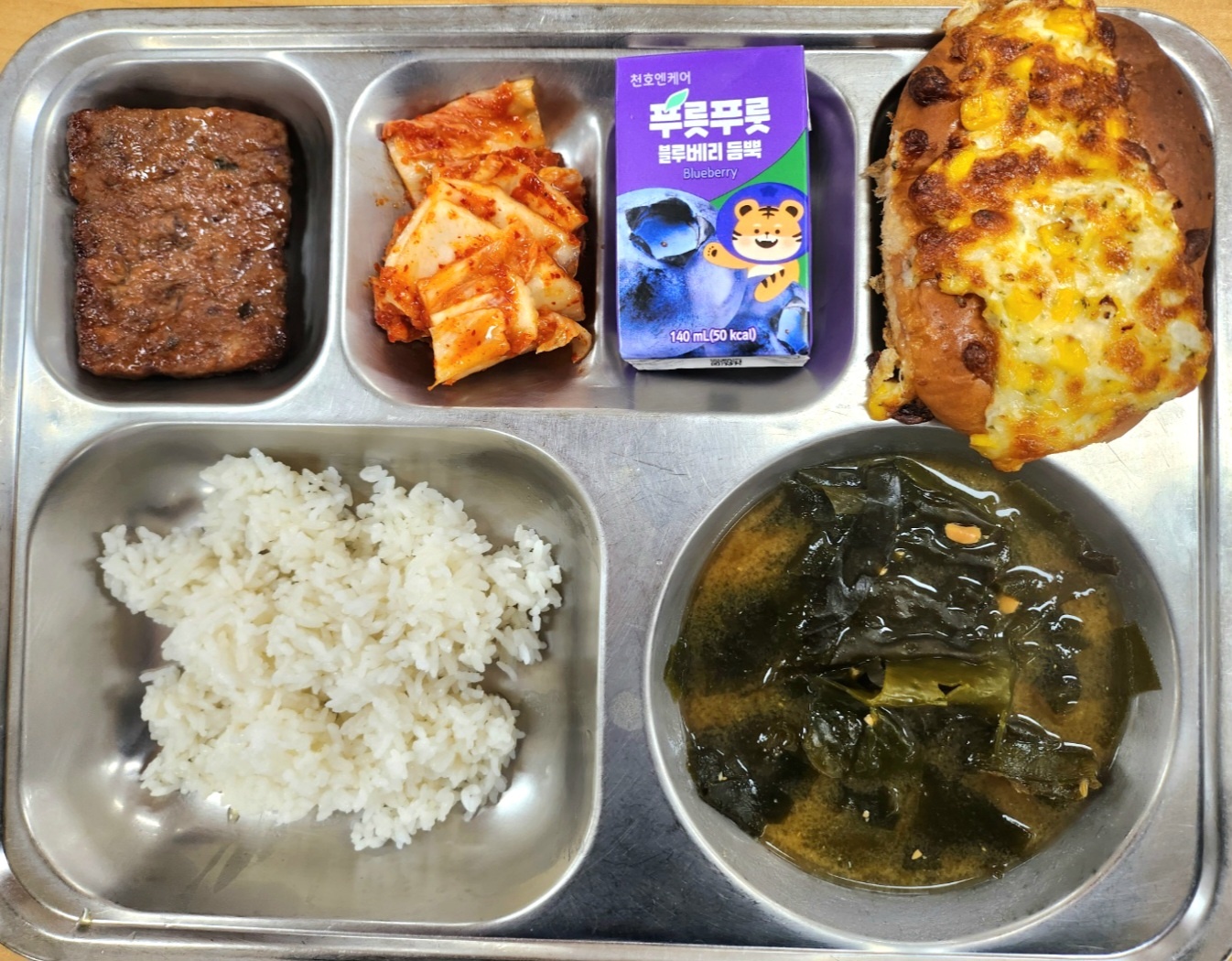 [조식] 친환경찹쌀밥,미역장국,남도떡갈비,배추김치,콘치즈소시지빵,푸릇푸릇블루베리듬뿍주스