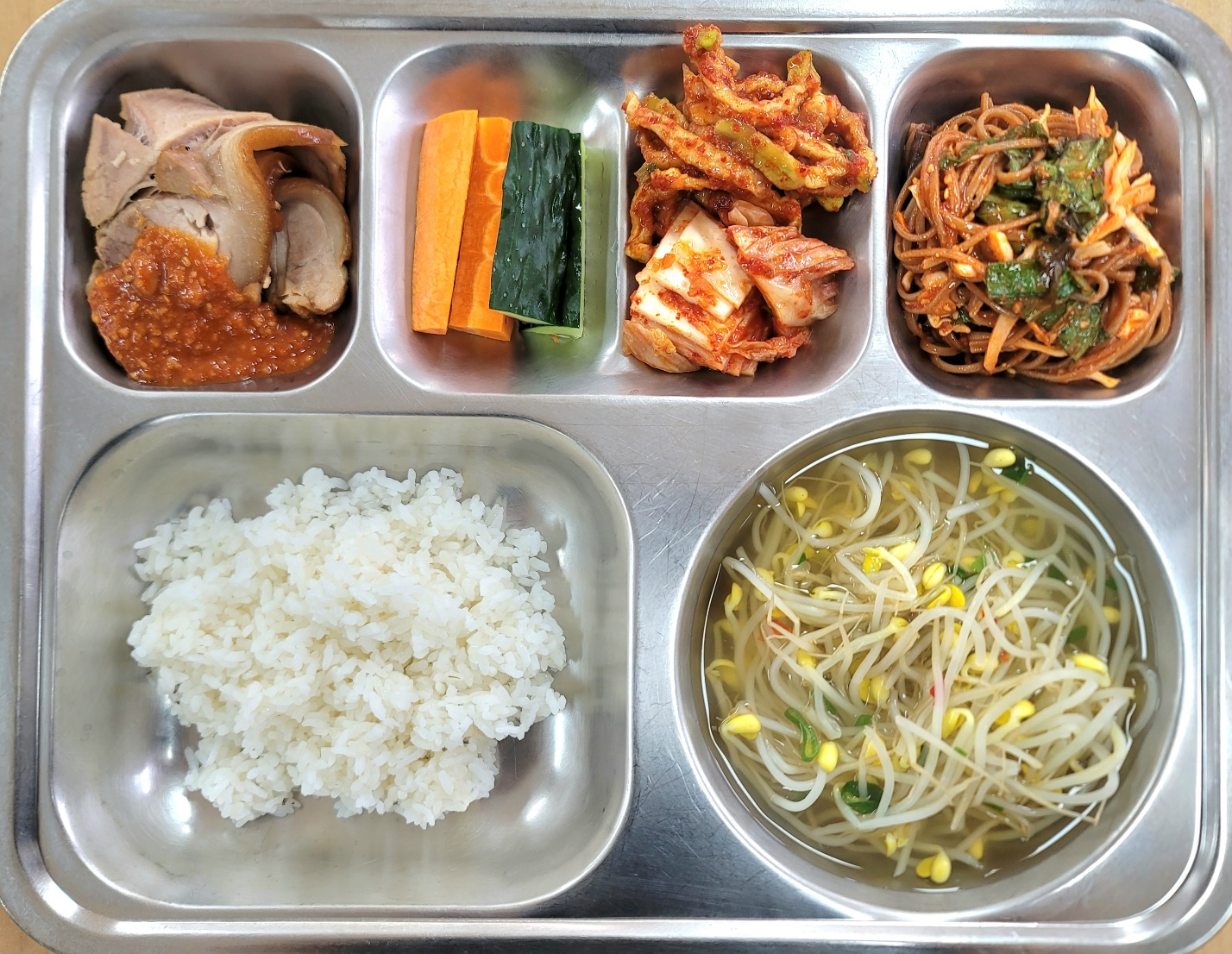 [중식] 친환경찹쌀밥,홍초콩나물국,장충동왕족발,비빔막국수,무말랭이무침,배추김치,채소스틱(자율)