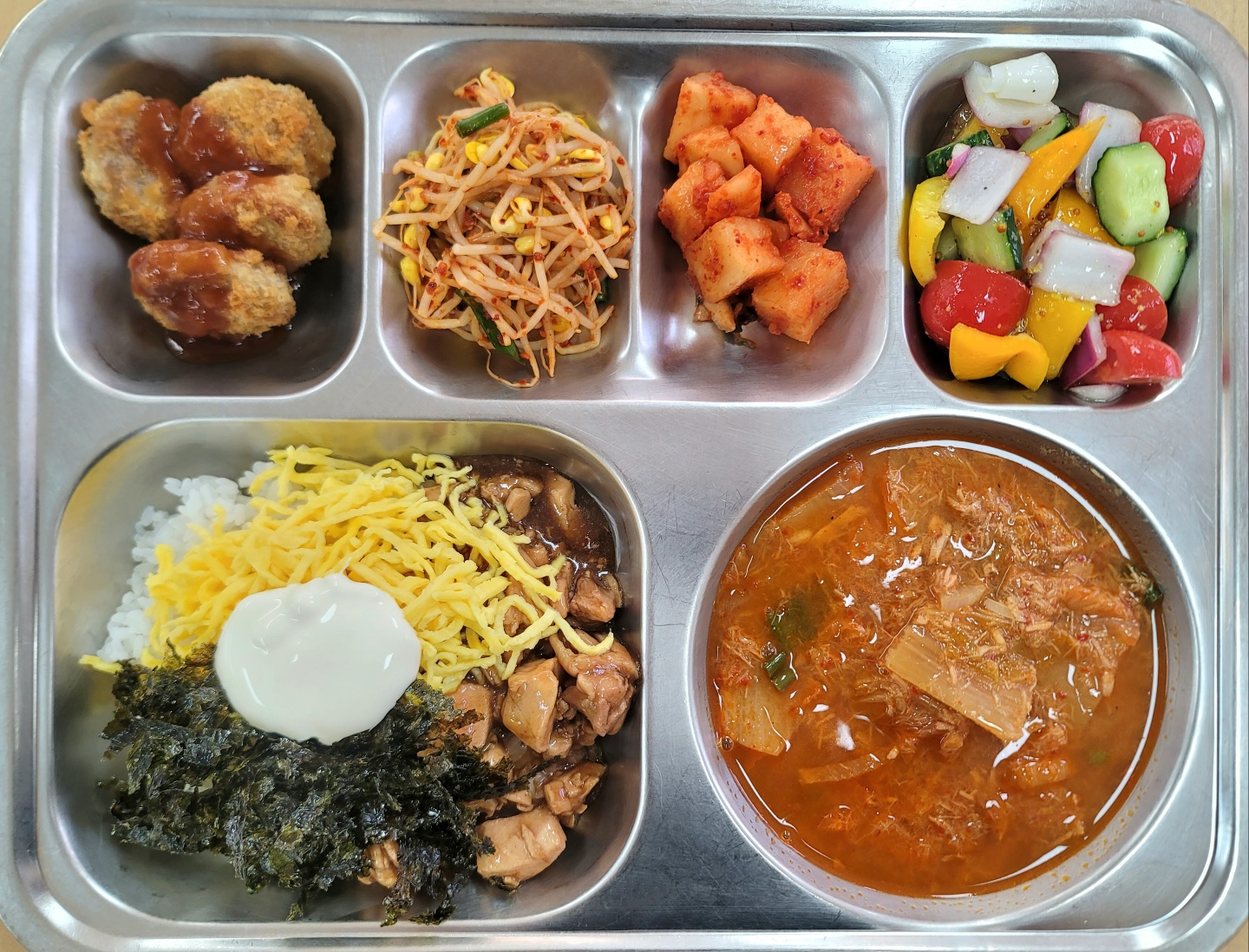 [중식] 치킨데리야끼마요덮밥,참치김치찌개,한입쏙까스,지중해식샐러드,매콤콩나물무침,깍두기
