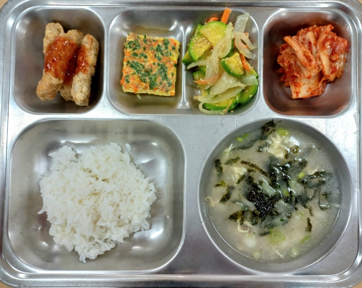 [조식] 친환경찹쌀밥,조랭이떡국,돈육스틱카츠강정,계란찜,애호박볶음(자율),배추김치