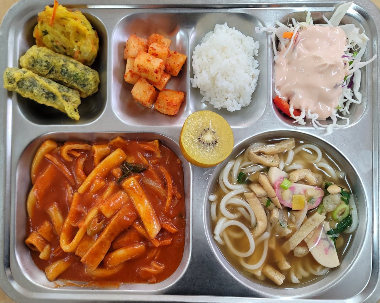 [중식] 미니밥(자율),어묵유부미니우동,후루룩밀떡볶이,채소모둠튀김&김말이튀김,양배추샐러드/사우전D,깍두기,골드키위
