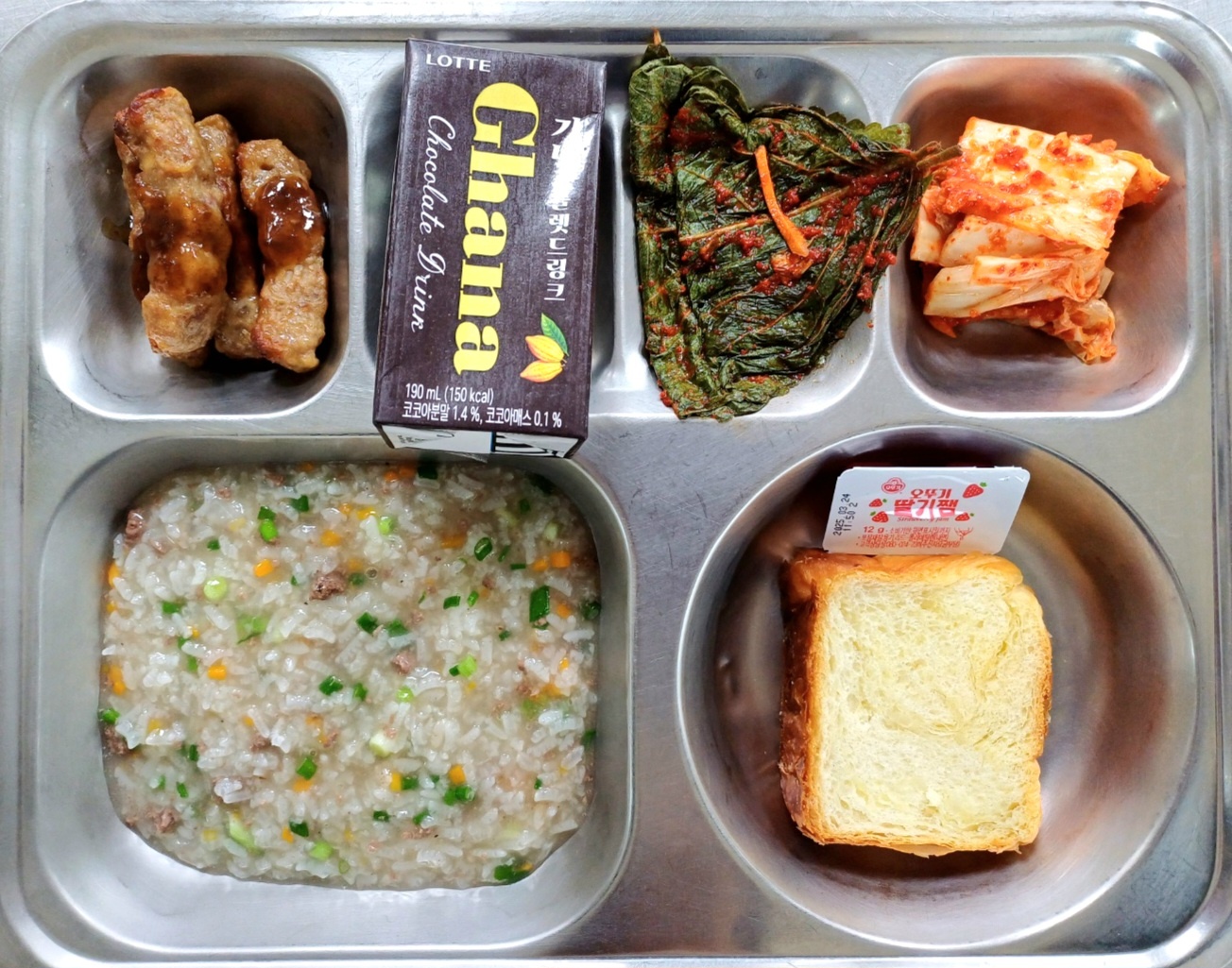 [조식] 쇠고기야채죽,떡갈비스틱구이,양념깻잎지,배추김치,데니쉬조각식빵*딸기잼,초코우유